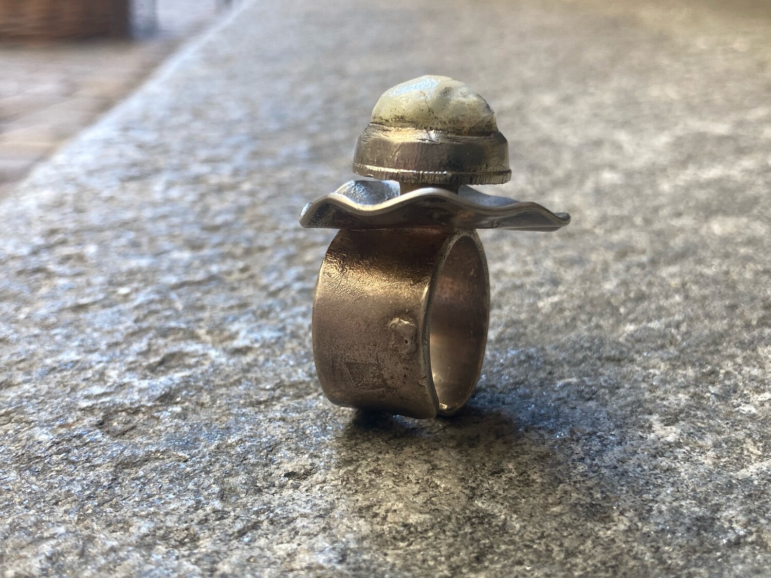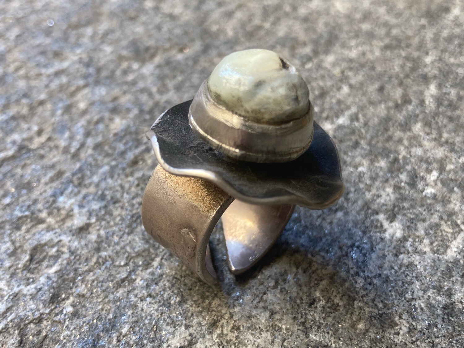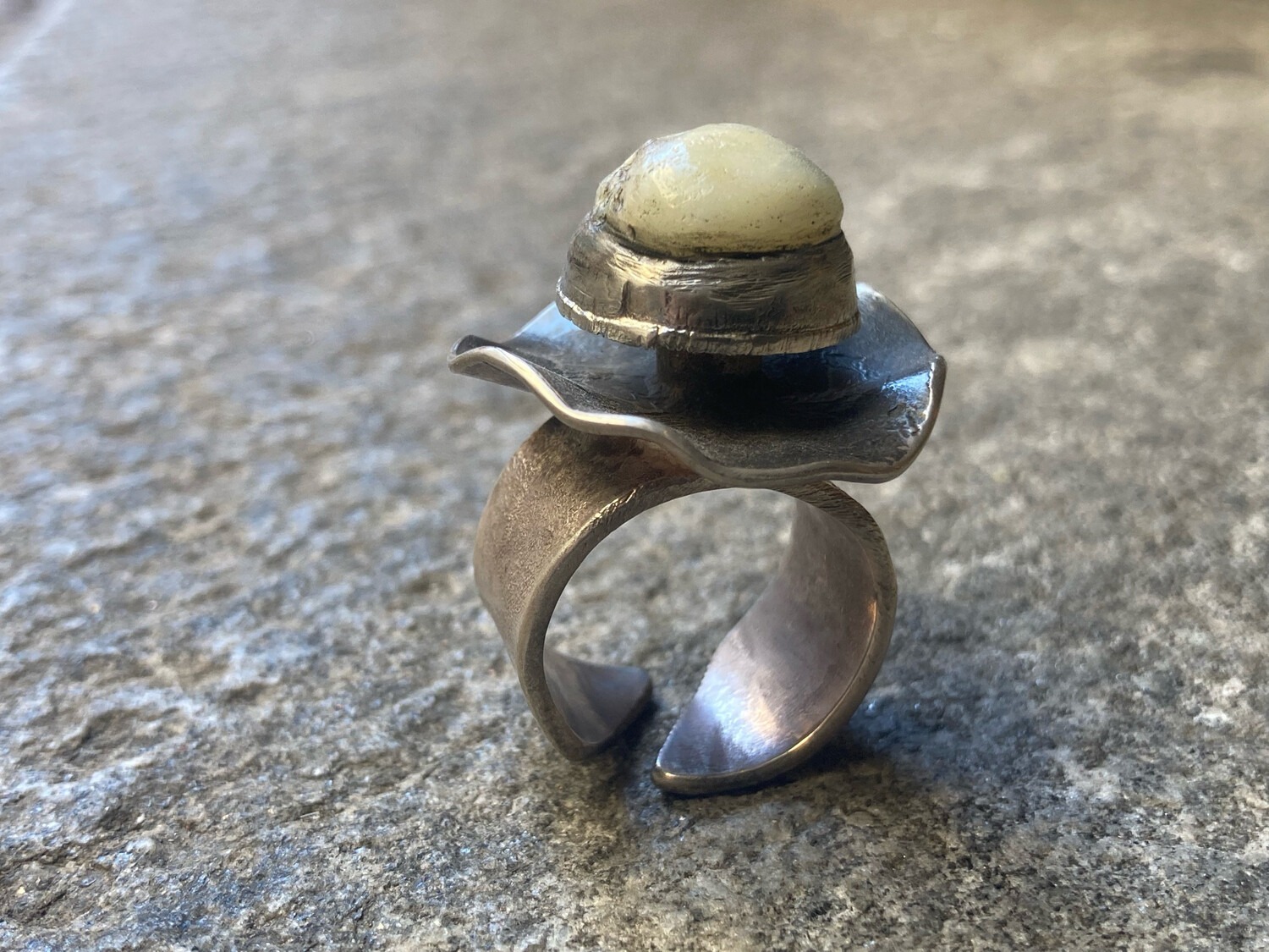 è un opale bianco peruviano, dal riflesso leggermente madreperlato