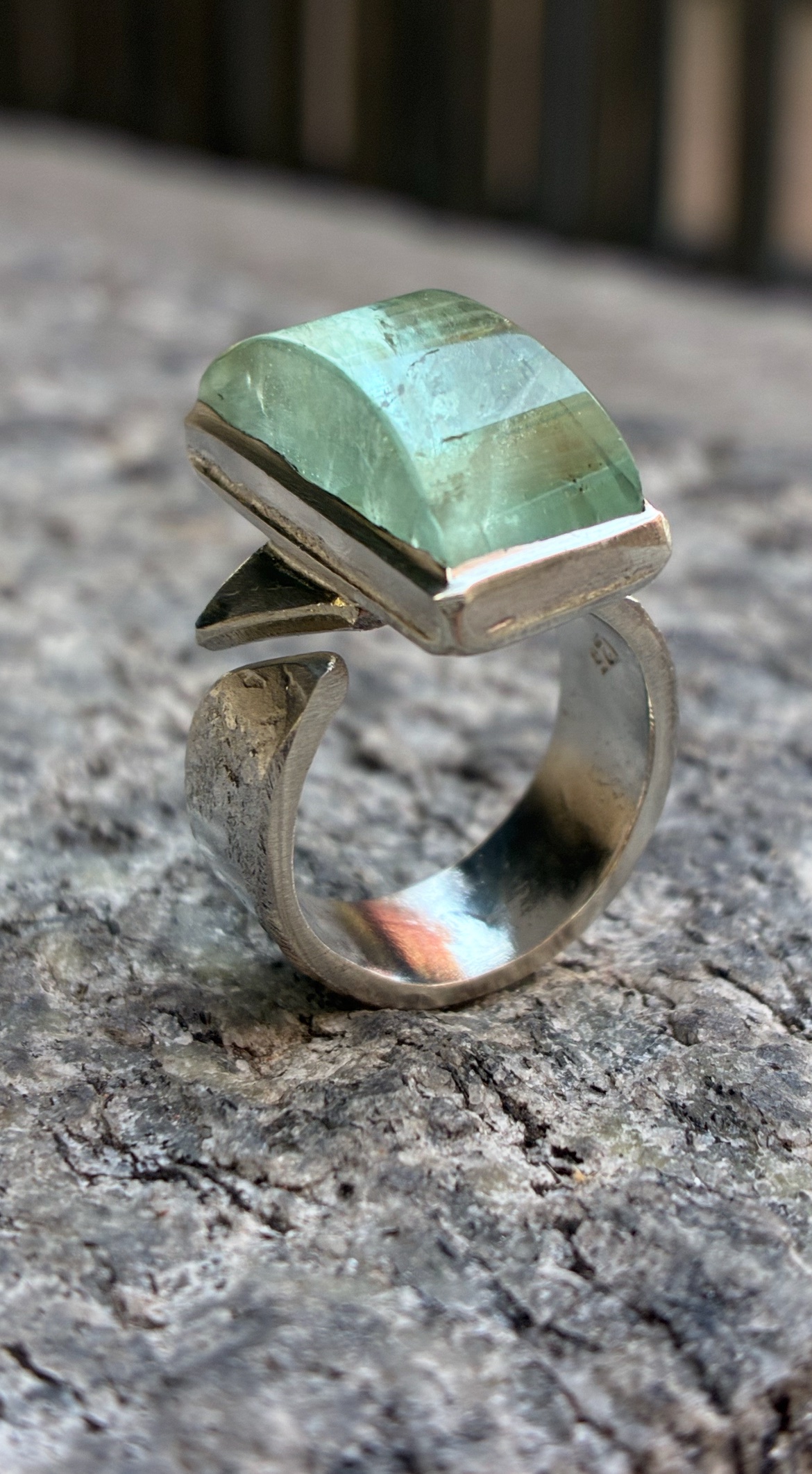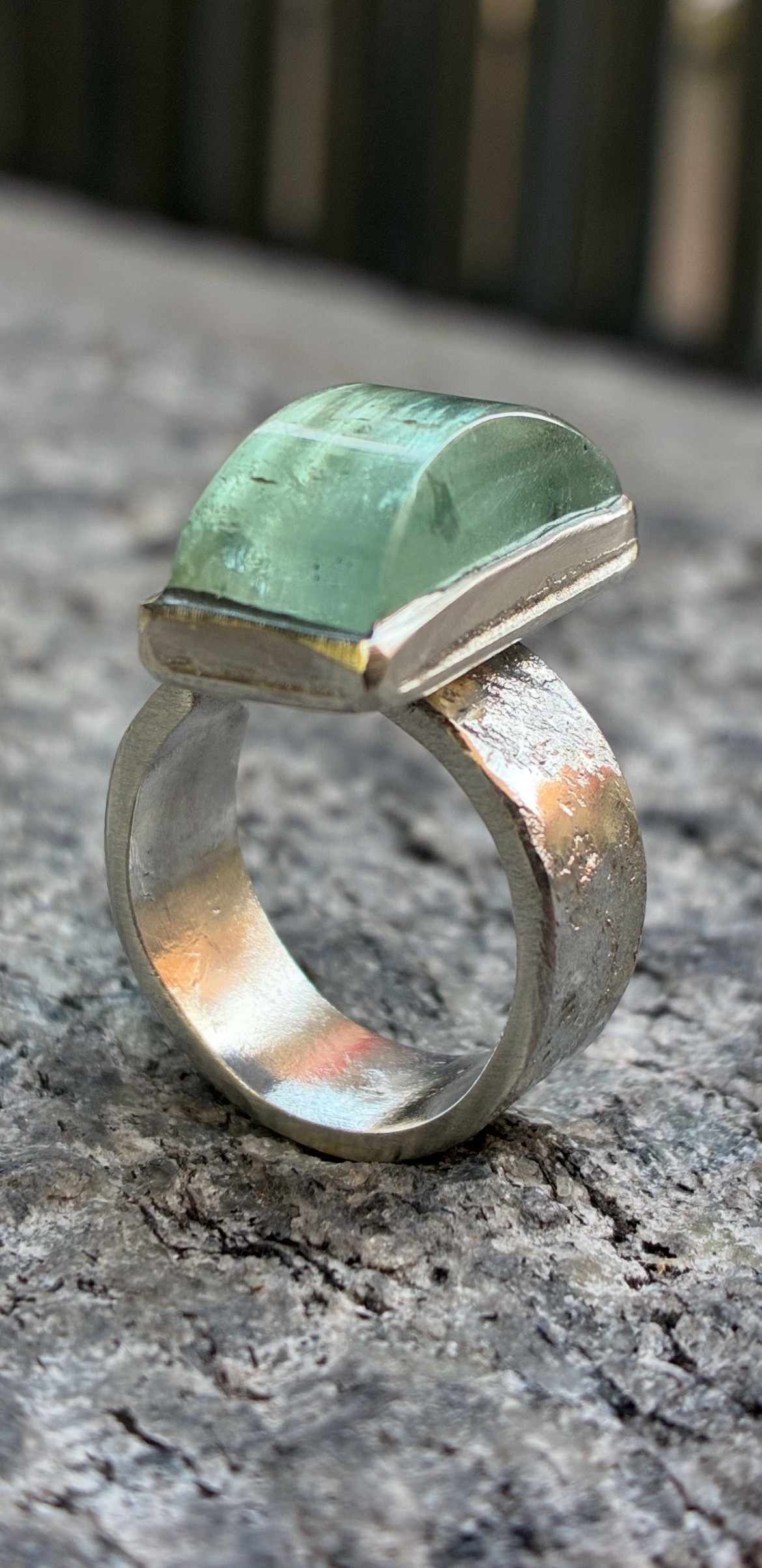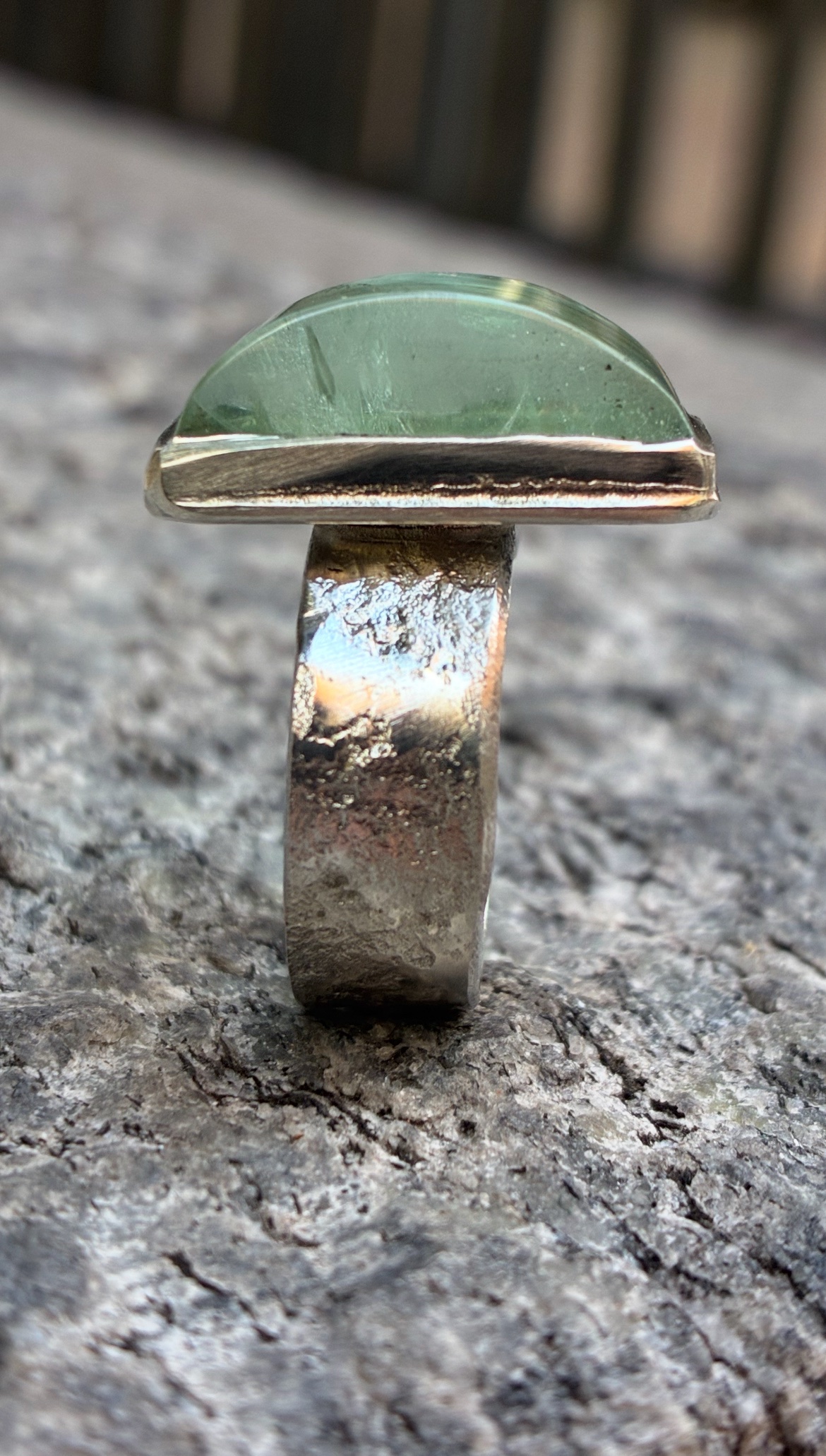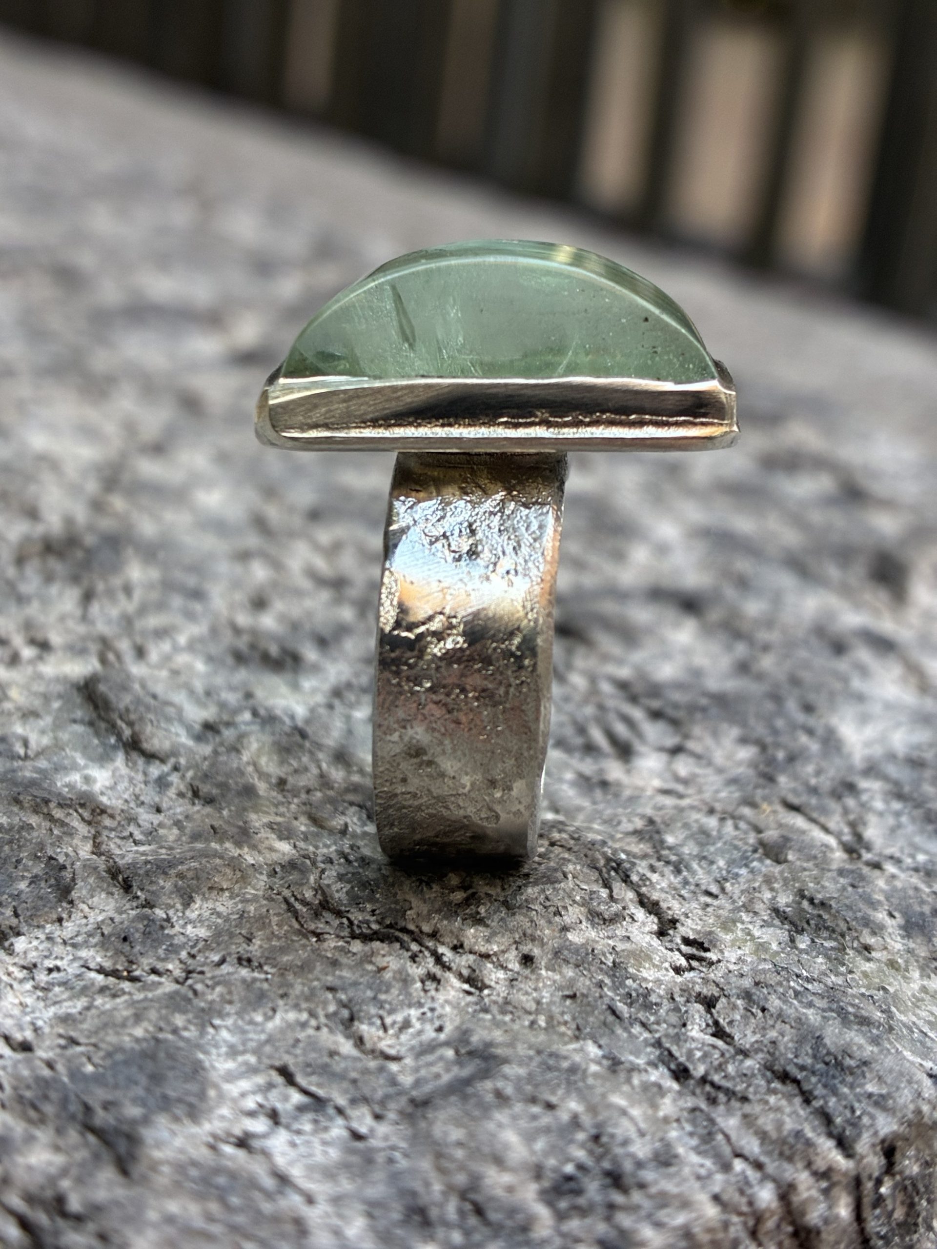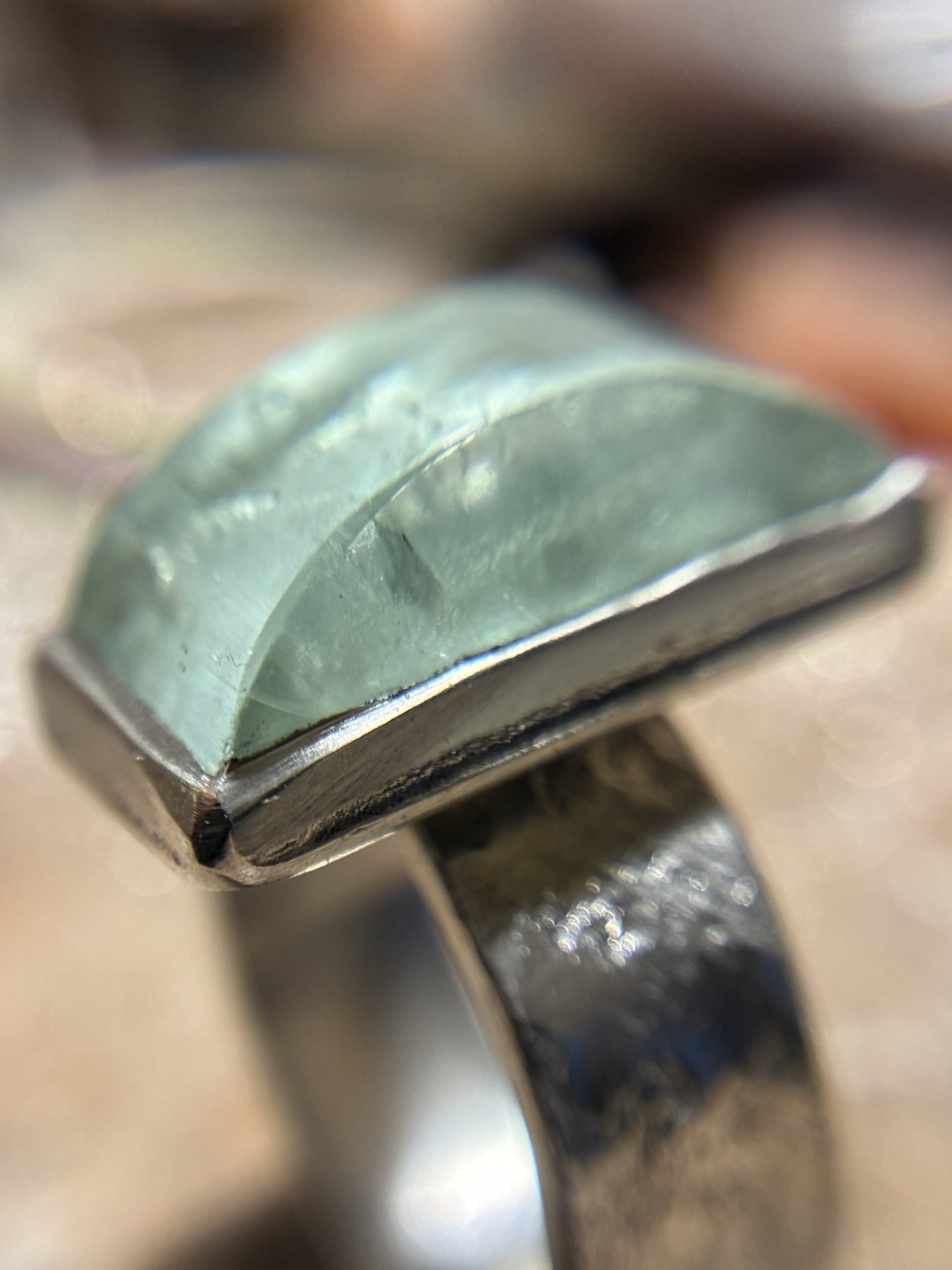 La montatura è realizzata in argento 925, picchiettato a mano per creare un leggero movimento superficiale che accompagna la linea della pietra senza coprirne la brillantezza.