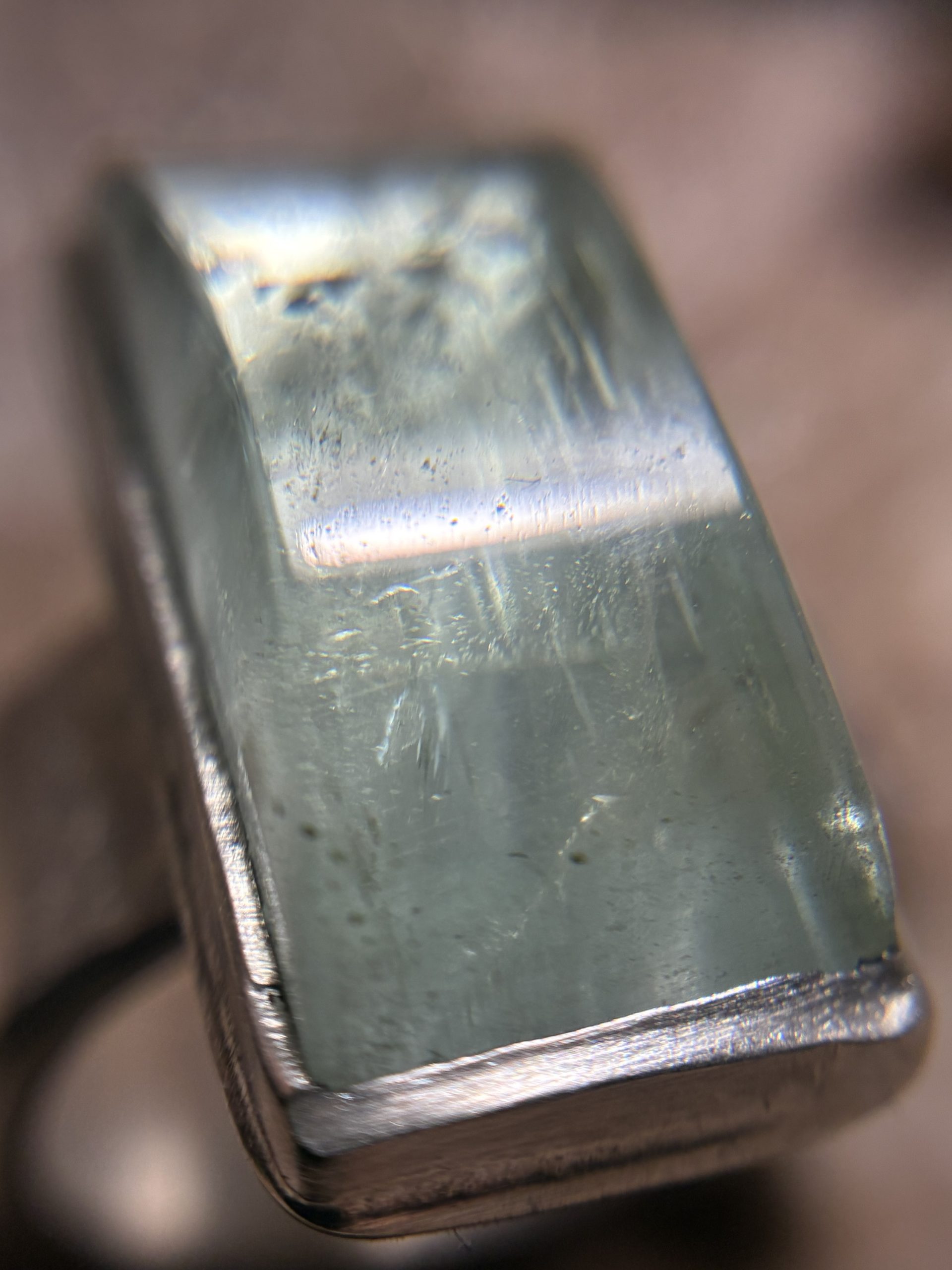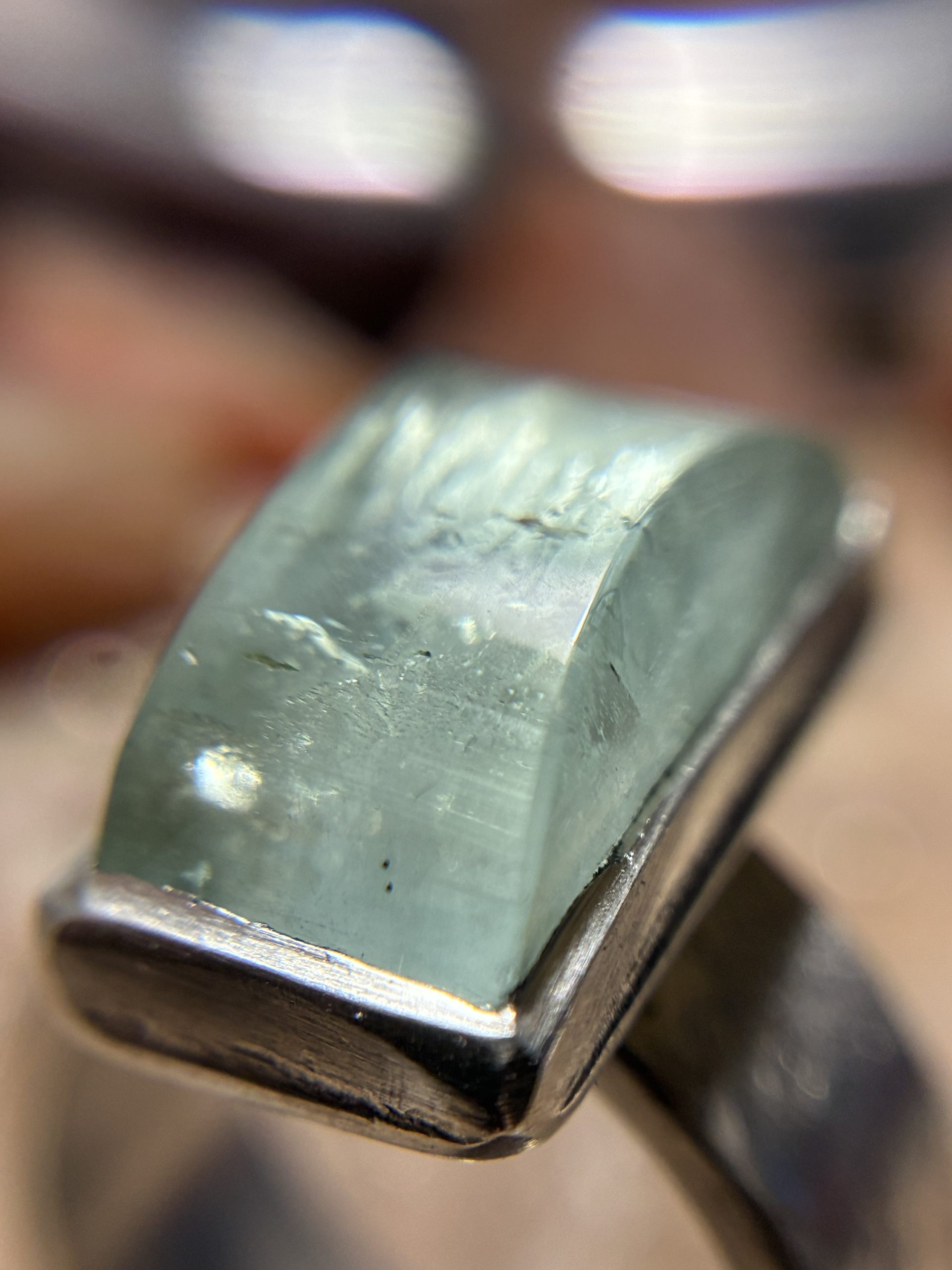 La forma del taglio e la trasparenza naturale di questa acquamarina sono gli elementi che definiscono il carattere del pezzo: una pietra luminosa e pulita.