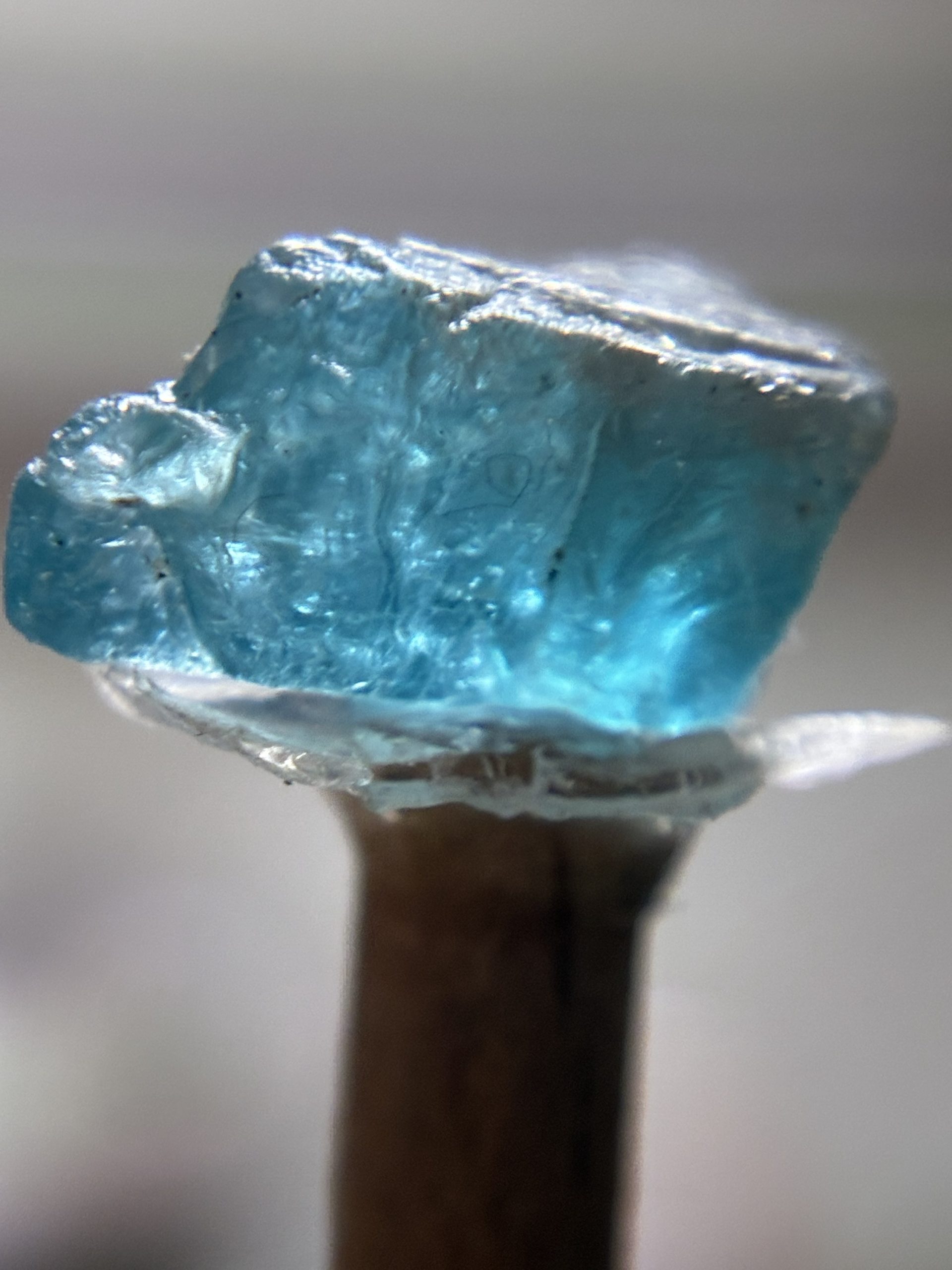 La pietra presenta le tipiche tonalità intense dell’apatite, con variazioni cromatiche che cambiano leggermente a seconda della luce.