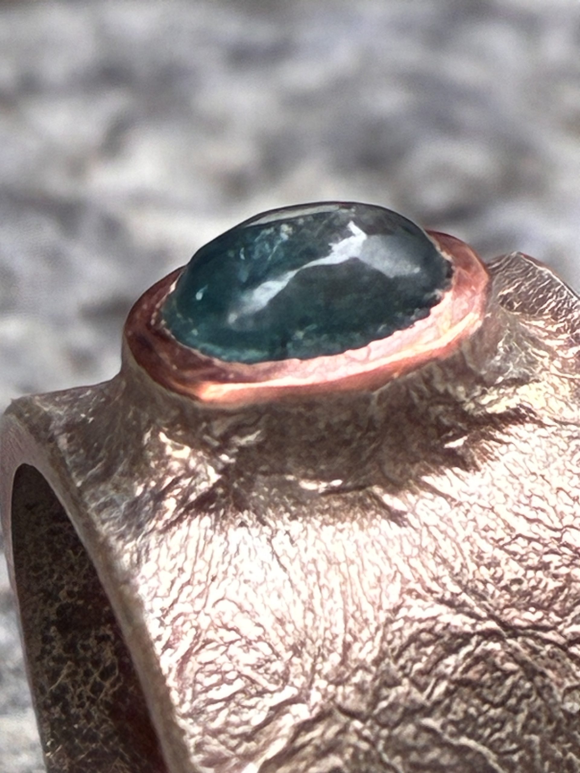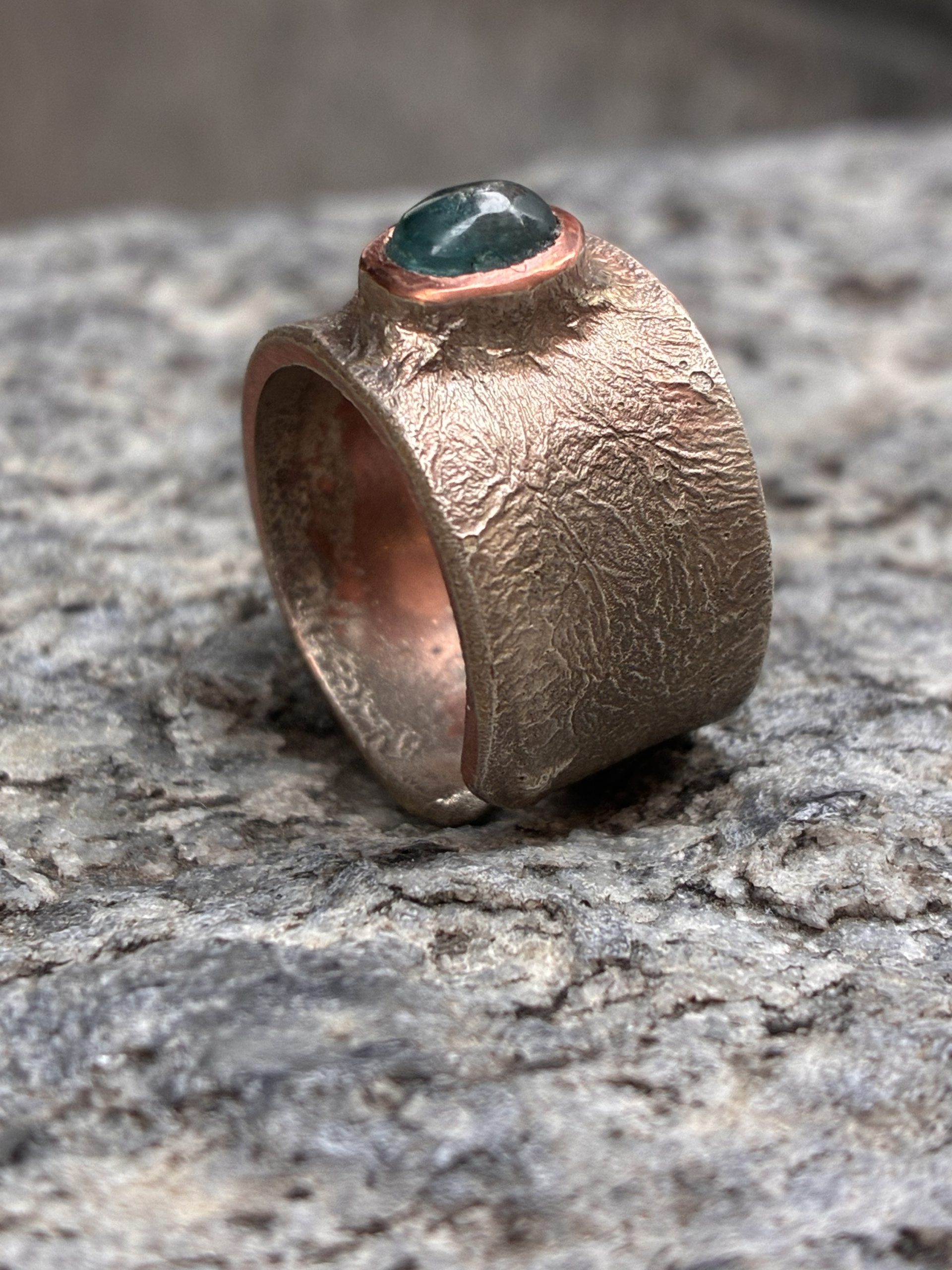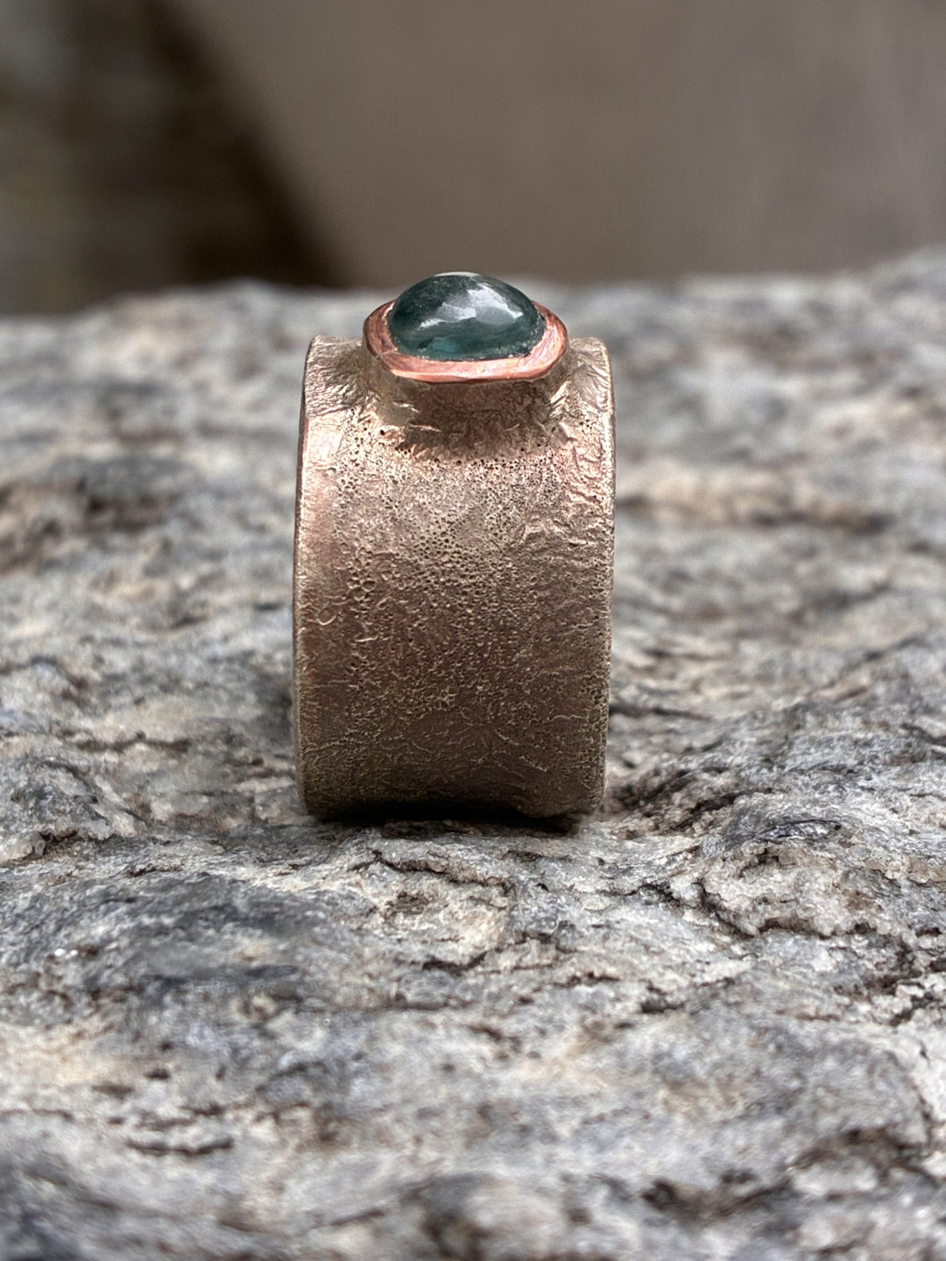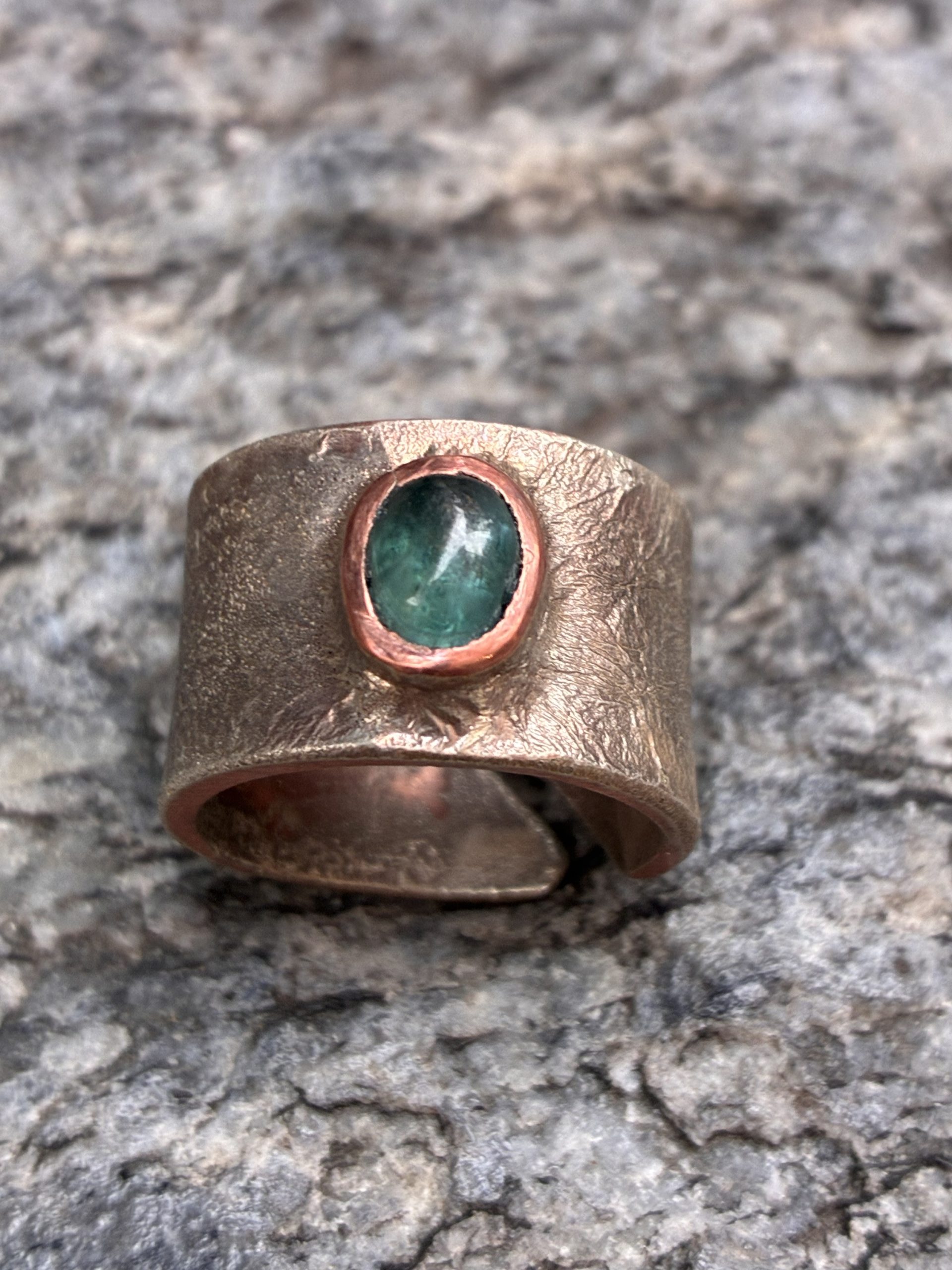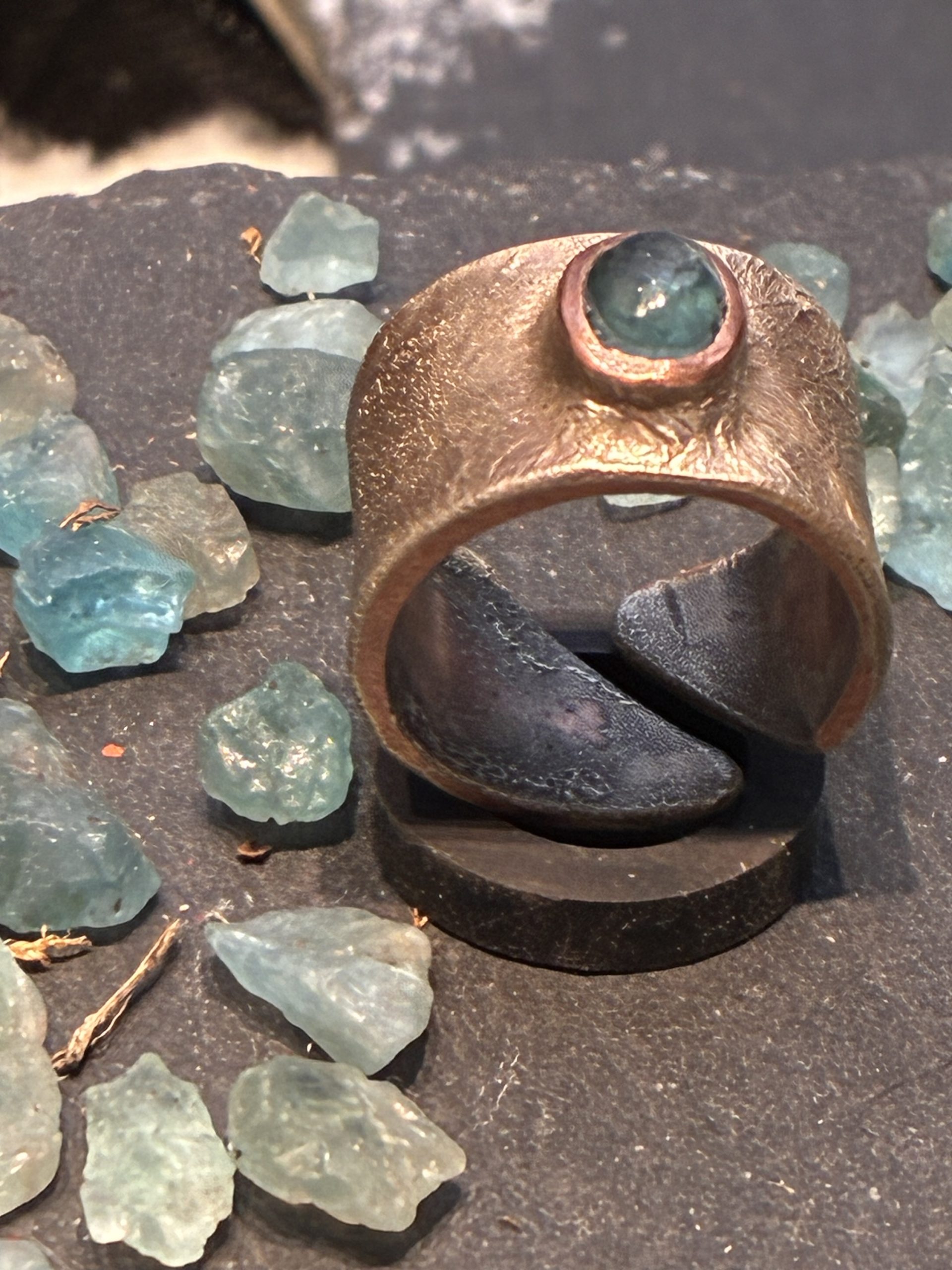 La montatura è realizzata artigianalmente in rame e argento, lavorati a fuoco, mantenendo una finitura non uniforme