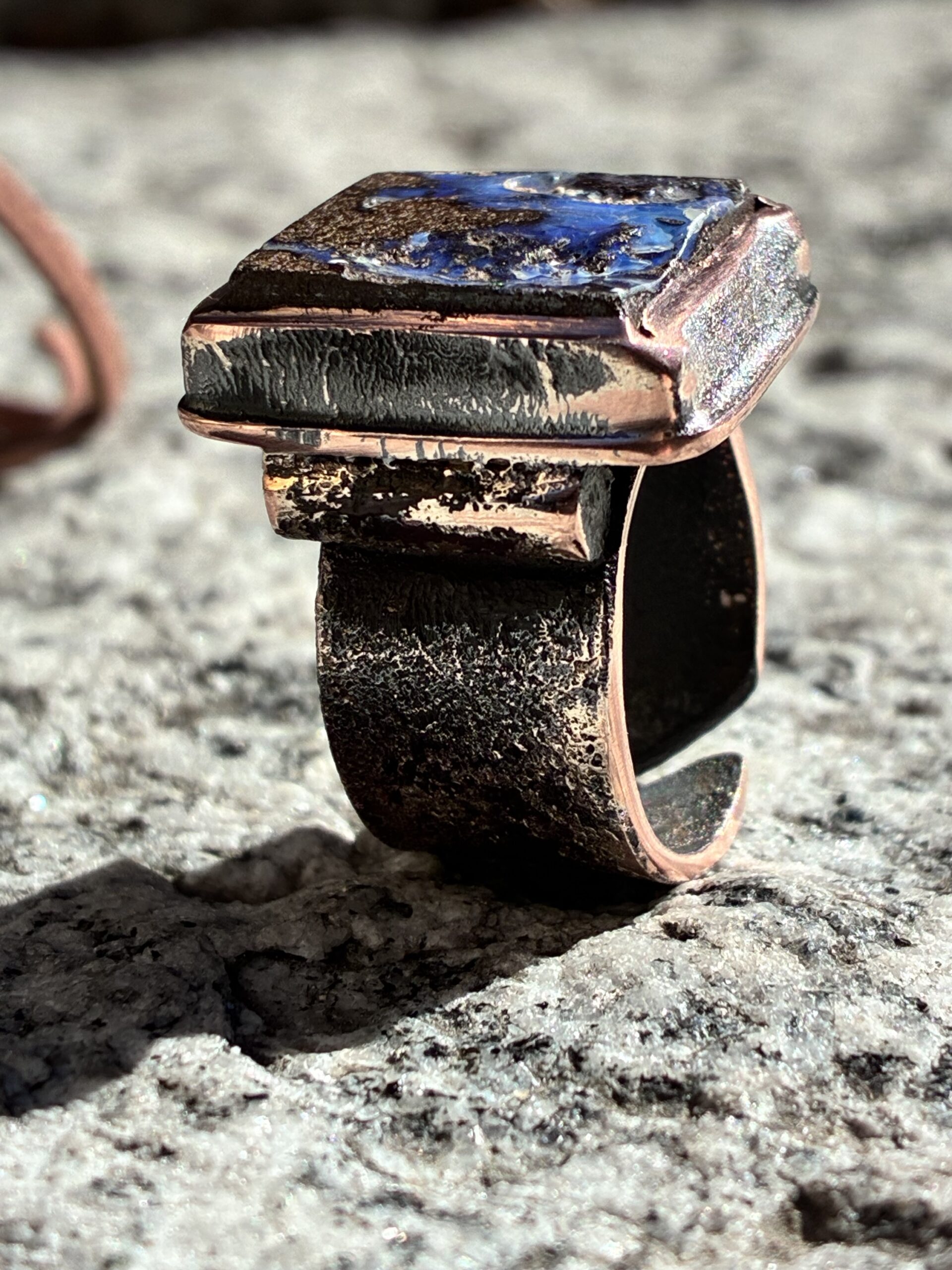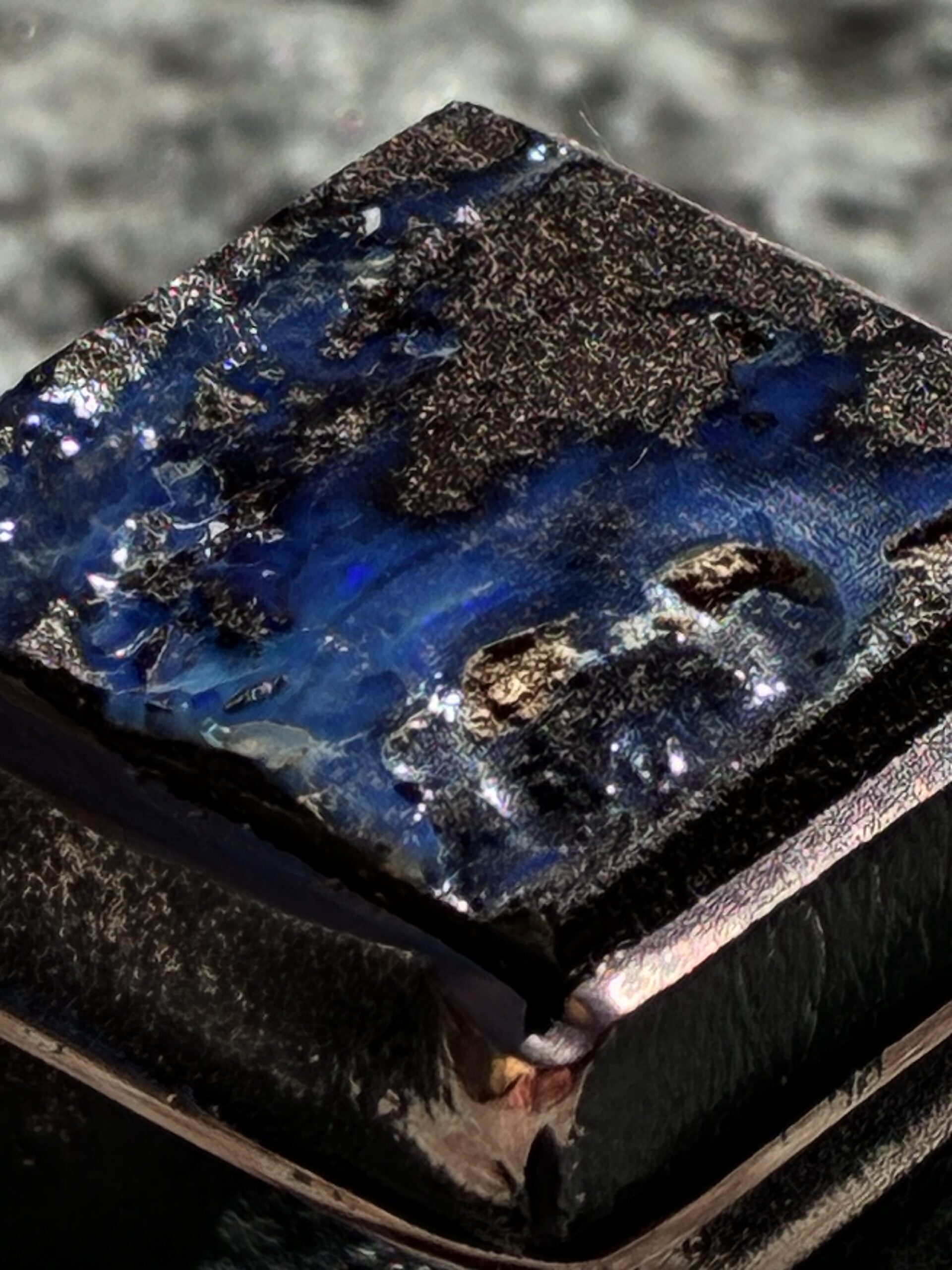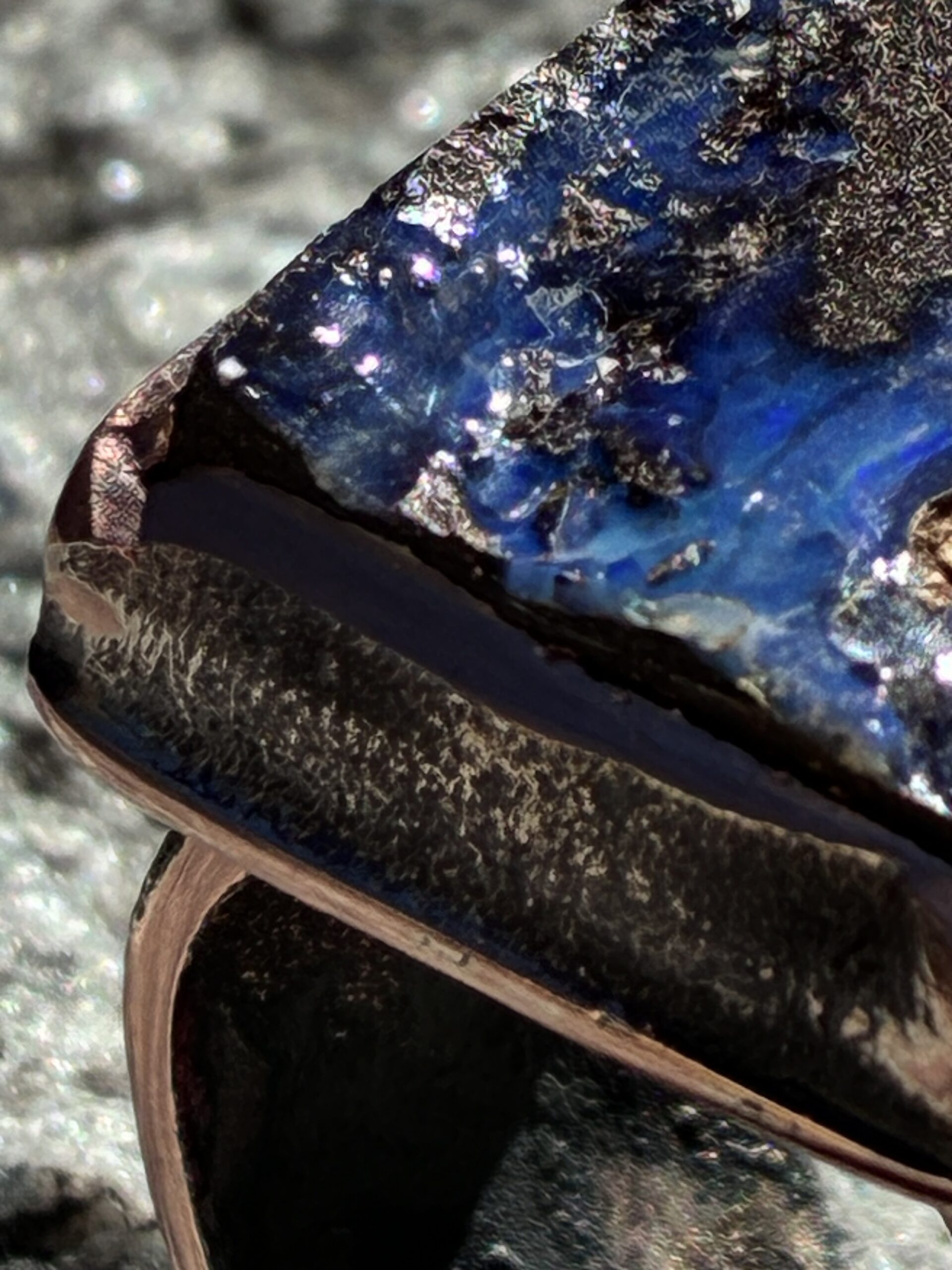 Ho scelto di mantenere la pietra parzialmente grezza per lasciare visibile la sua struttura naturale e il contrasto tra la matrice e i riflessi opalescenti, che si muovono tra il blu e altre tonalità a seconda della luce.