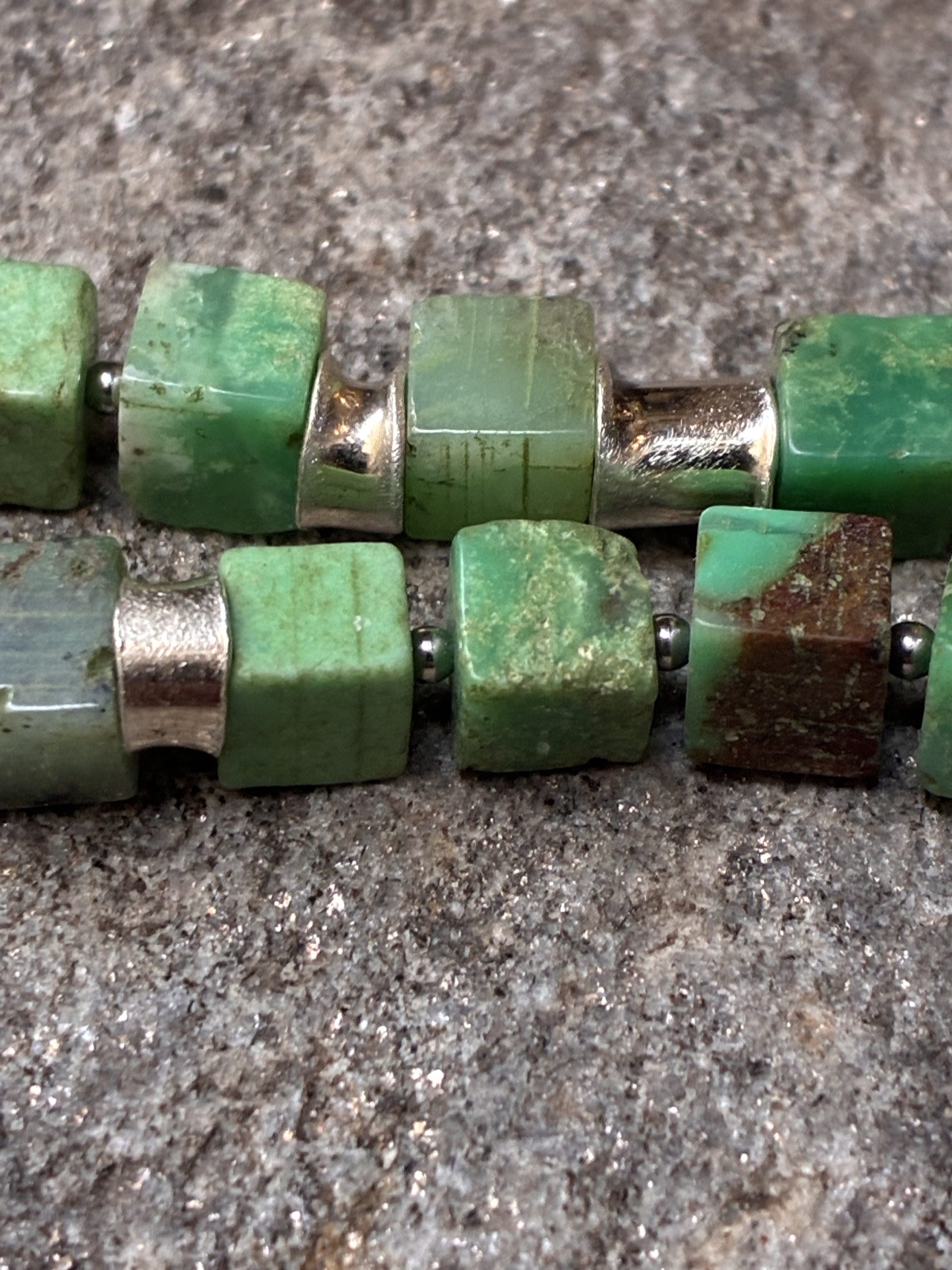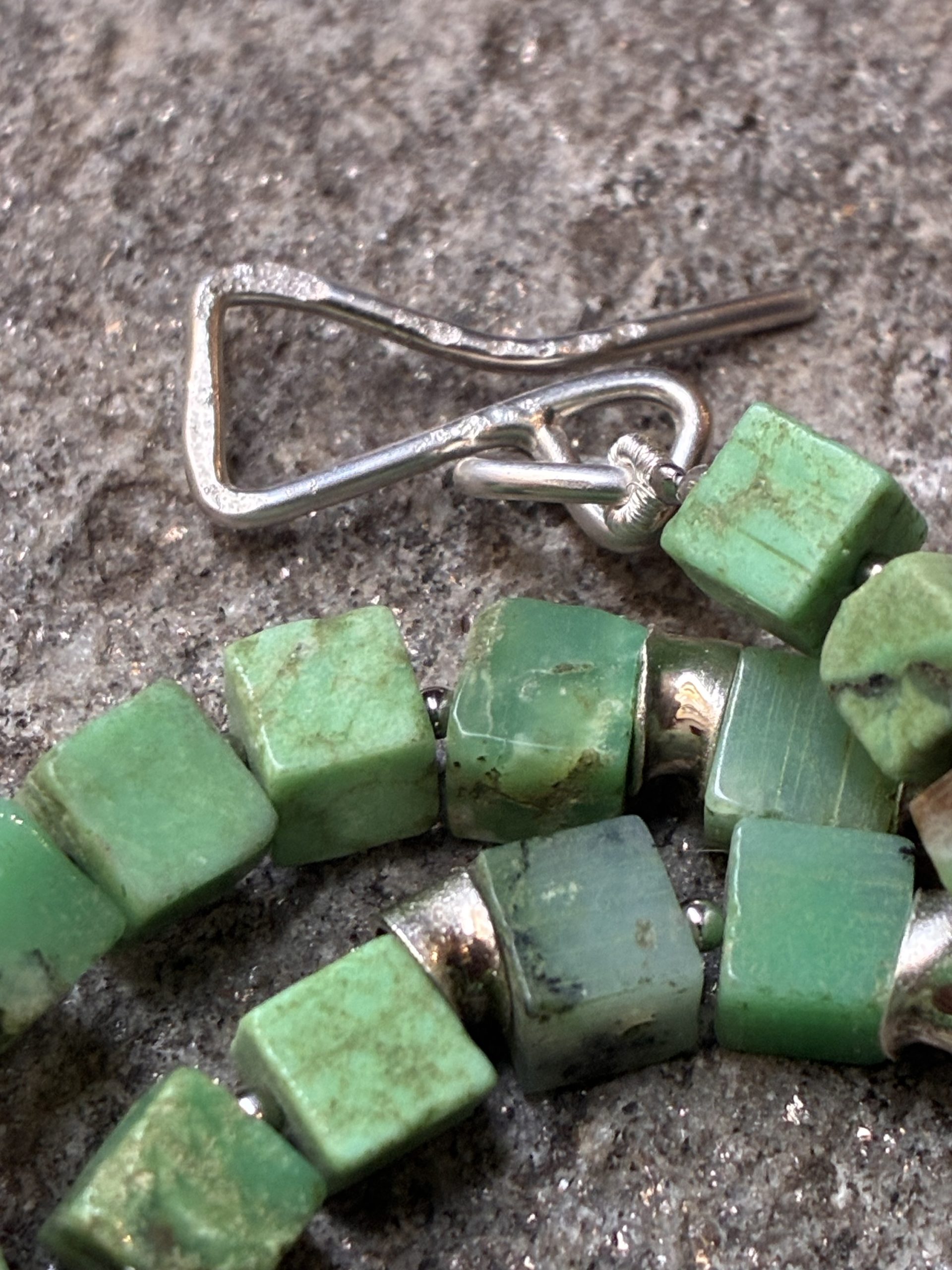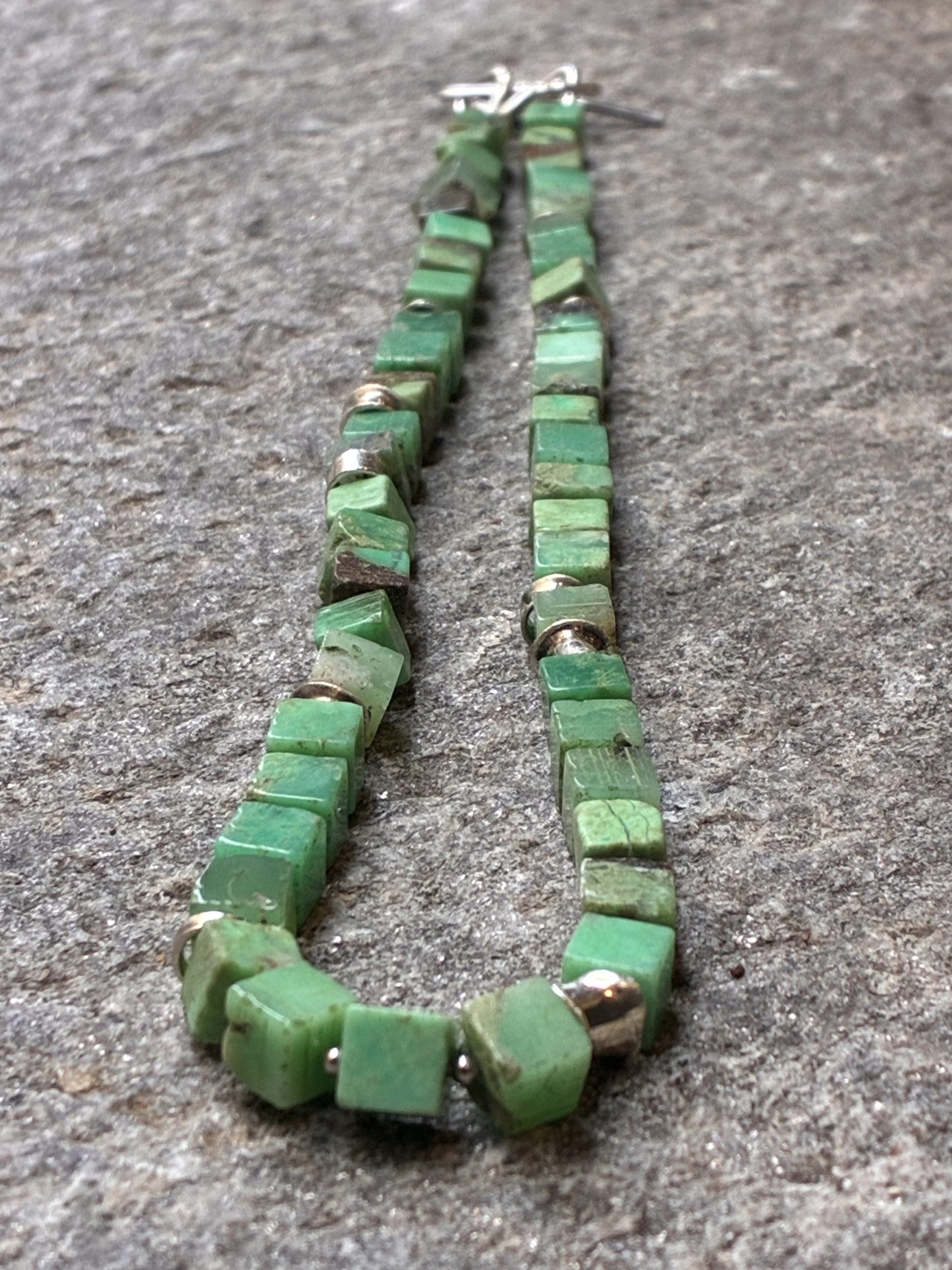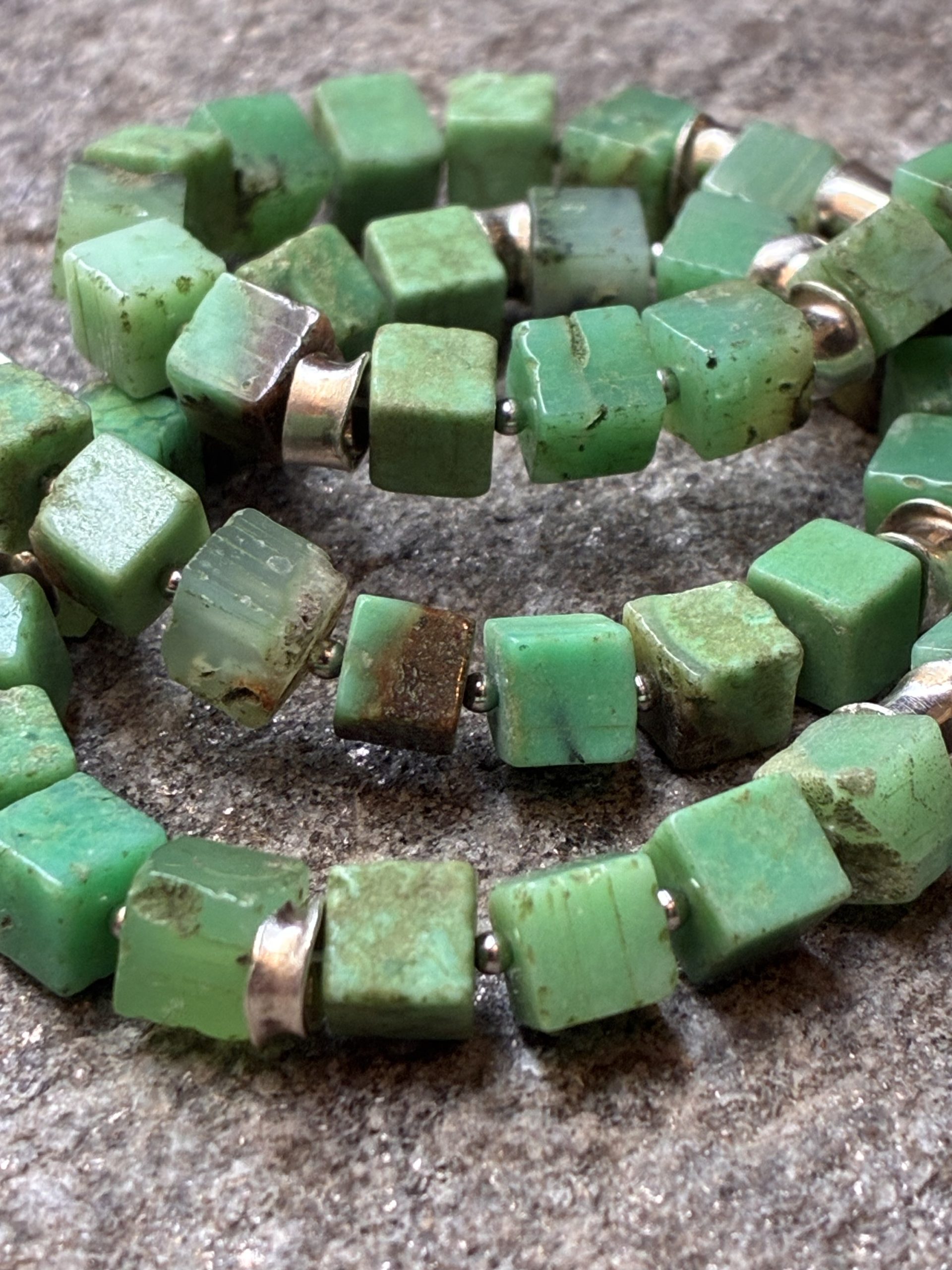 Questa collana è composta da cubetti di crisoprasio naturale, con lato di 7 mm, intervallati da elementi in argento 925 lavorati a mano.