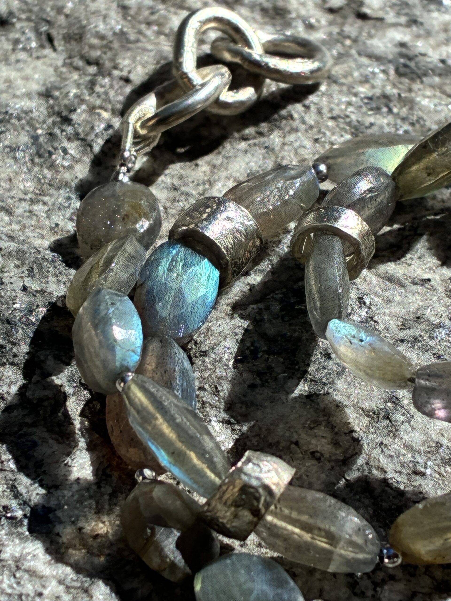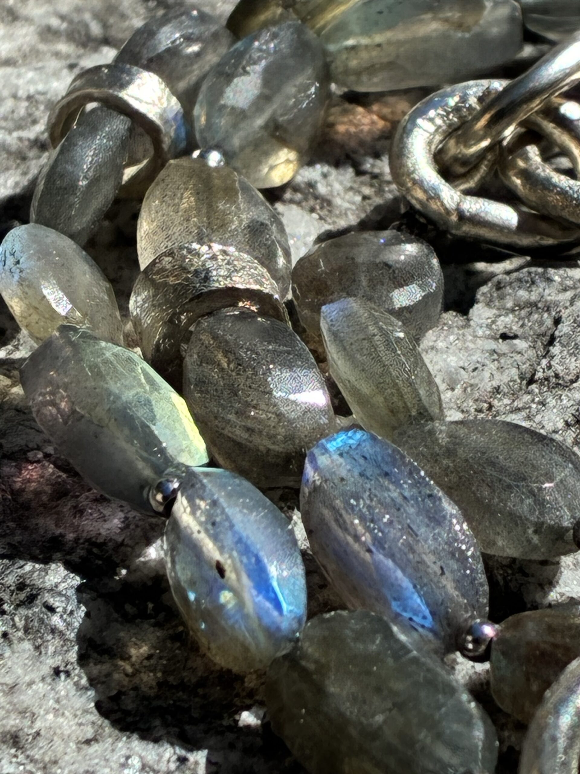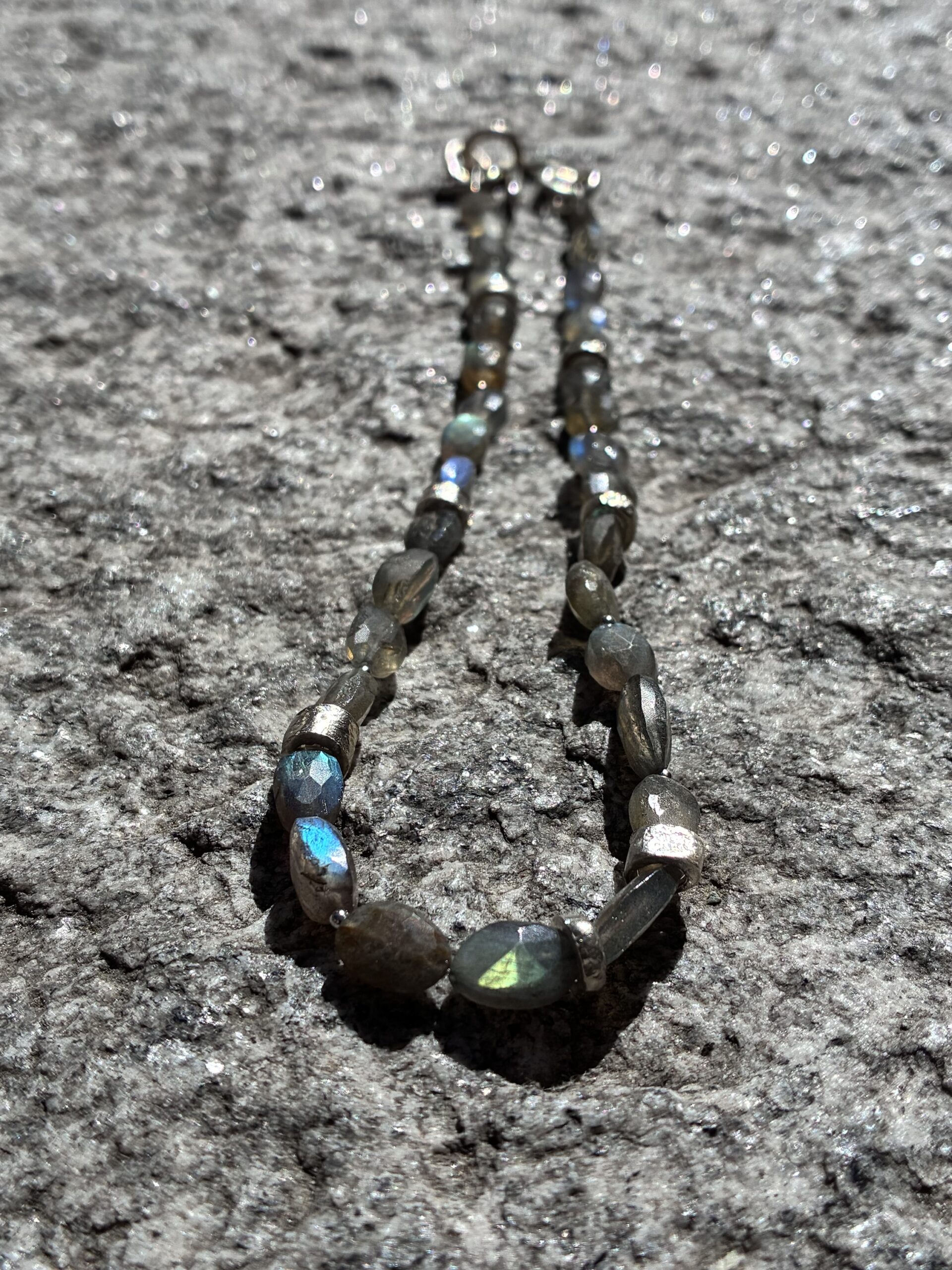 Lavorazione in Argento a fuoco su Rame e poi placcata Argento per questo girocollo dì Labradorite