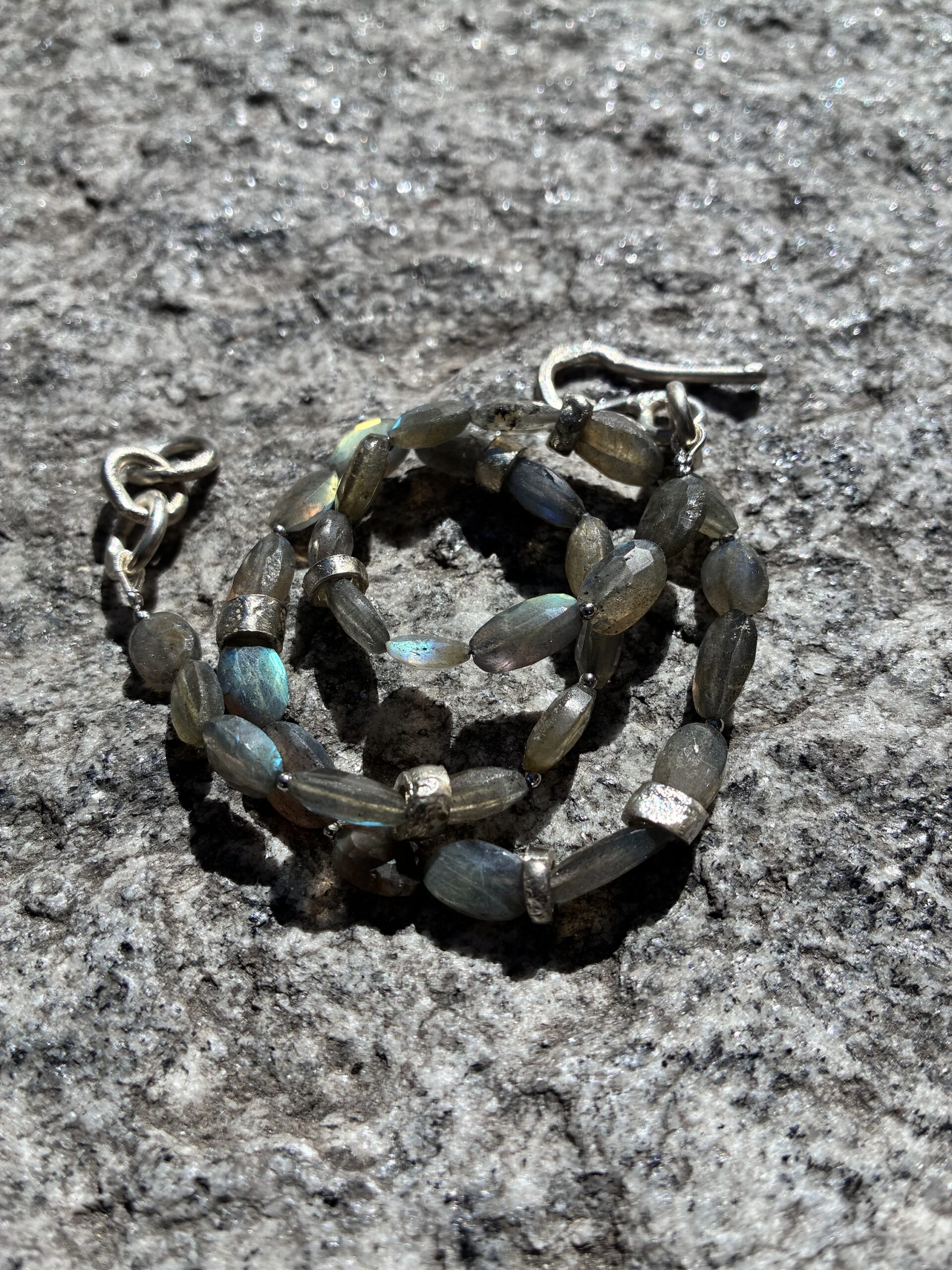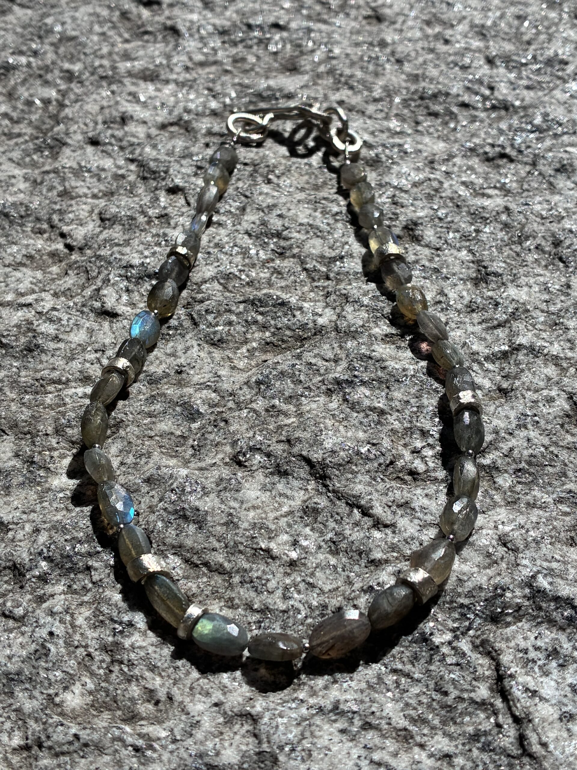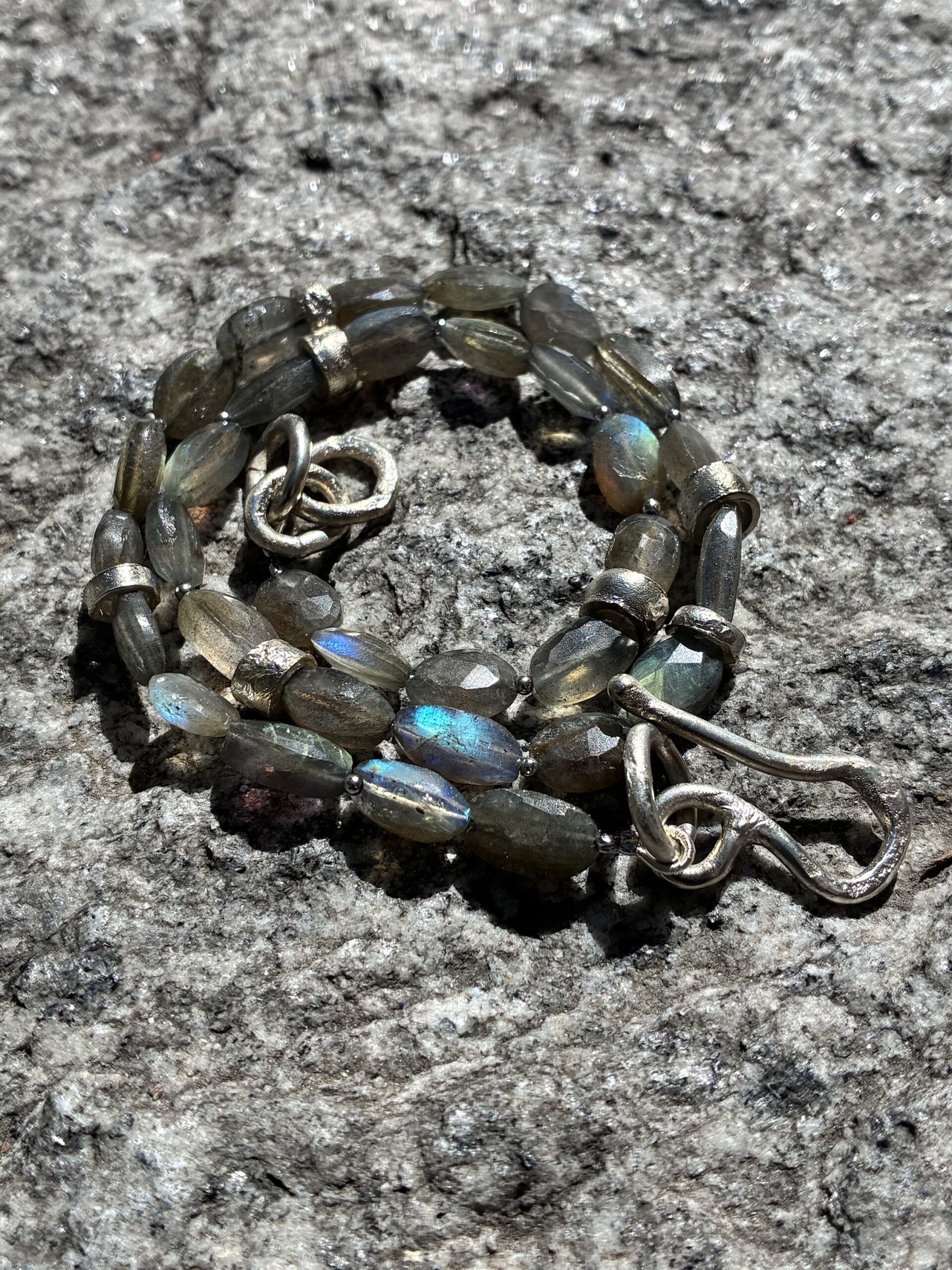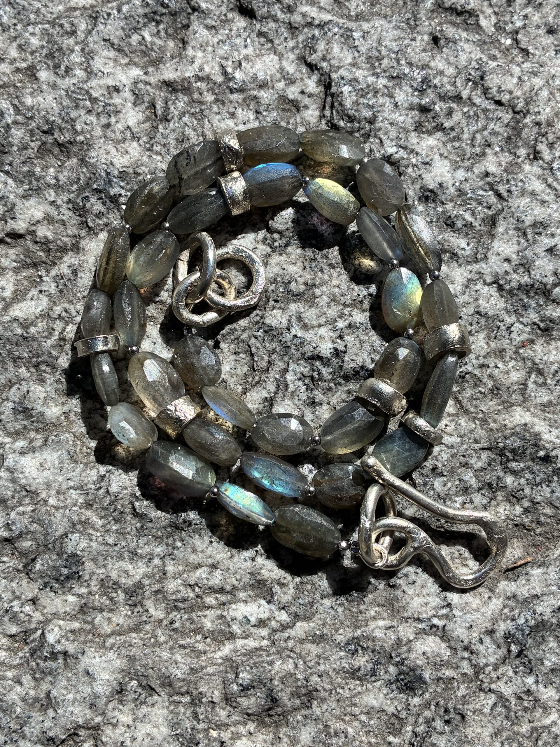 Lavorazione in Argento a fuoco su Rame e poi placcata Argento per questo girocollo dì Labradorite