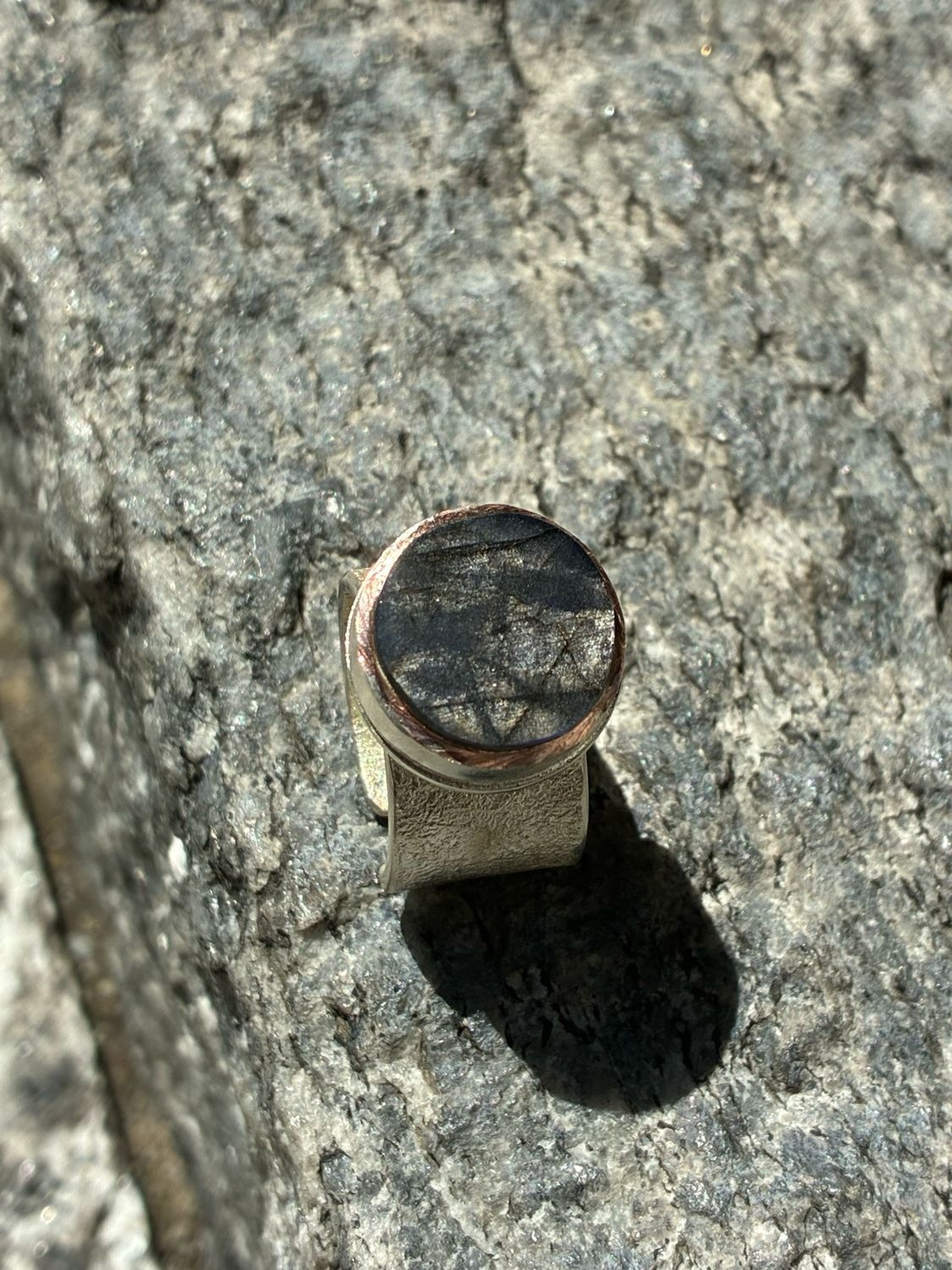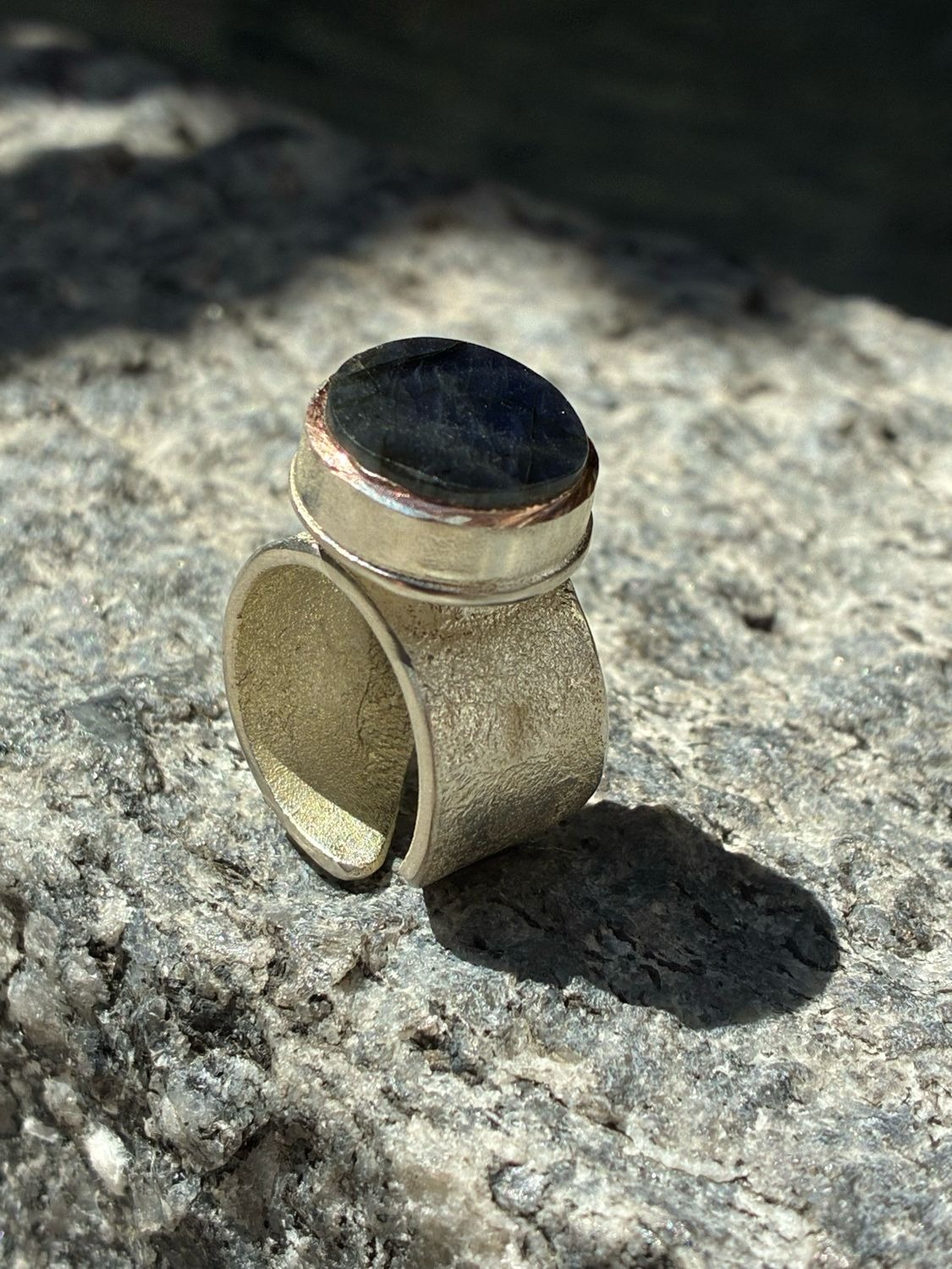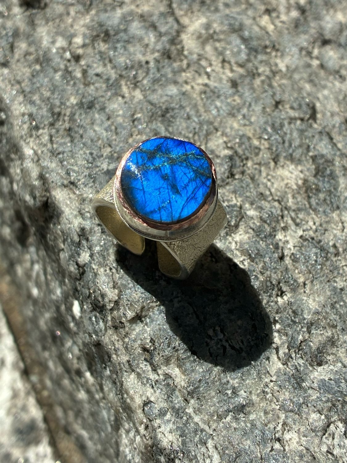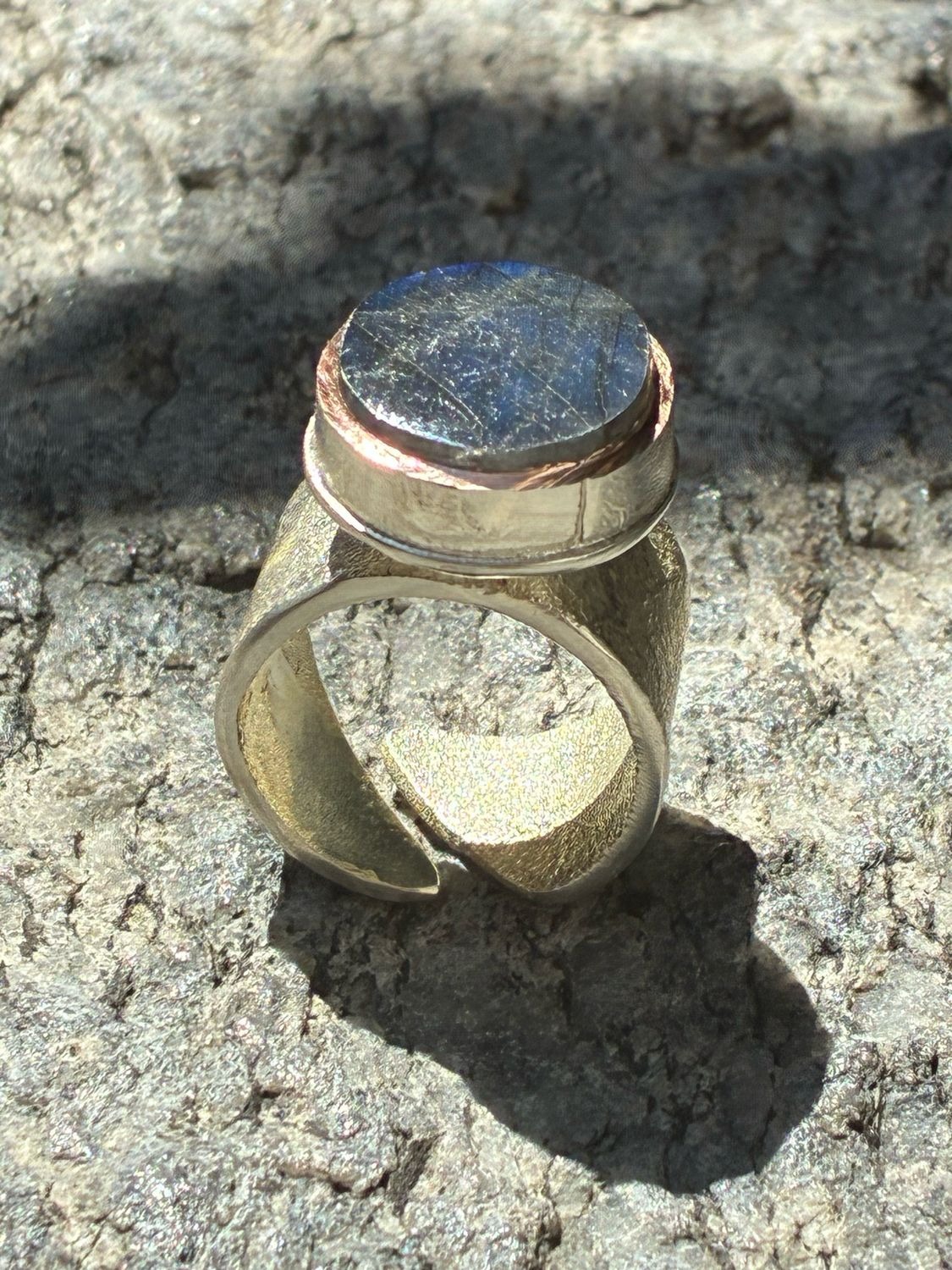 La labradorite di questo anello ha un riflesso davvero particolare: da un’angolazione emerge un blu acceso, mentre dall’altra appare un raro bagliore argenteo, molto poco comune in questo tipo di pietra.