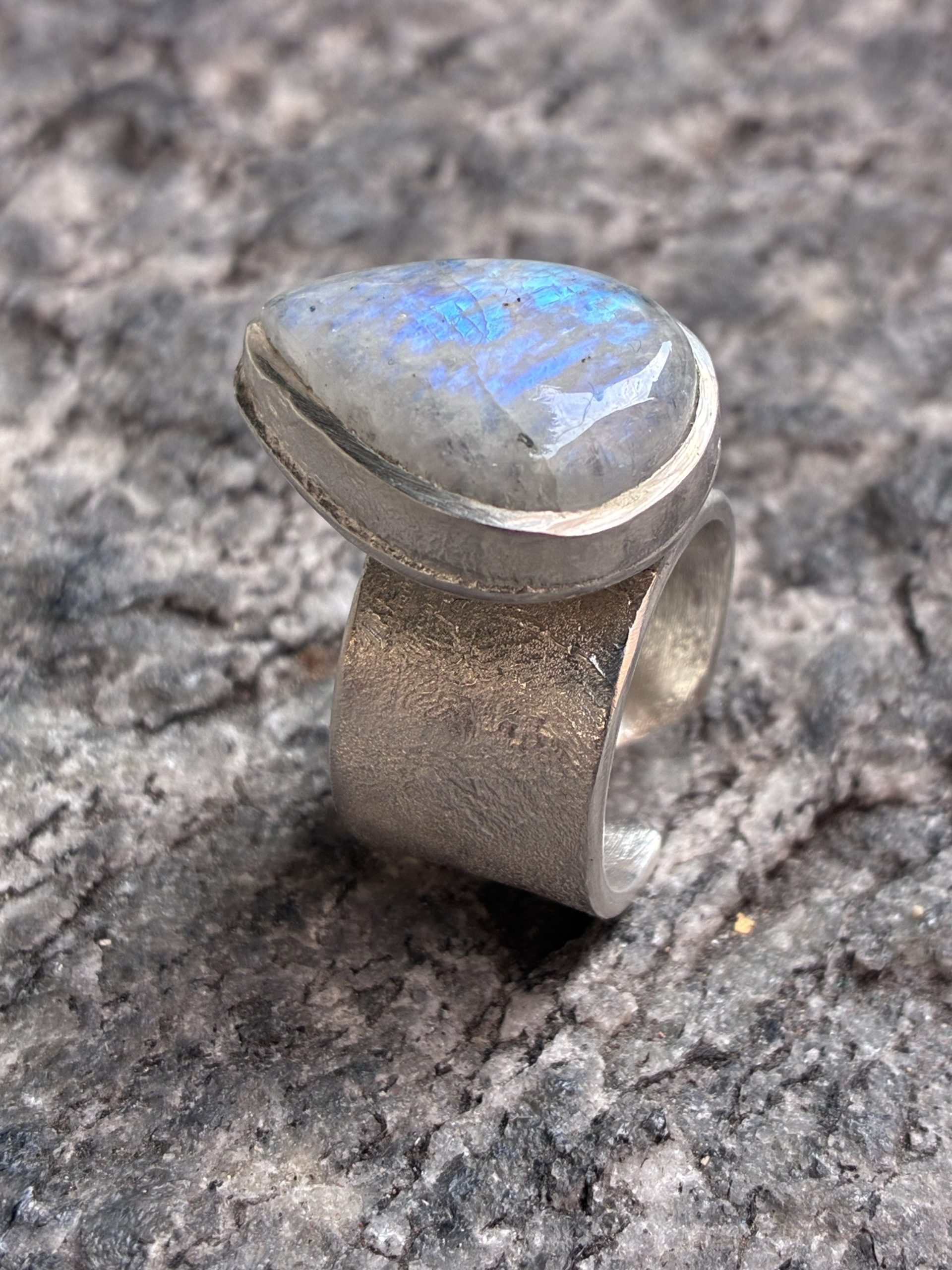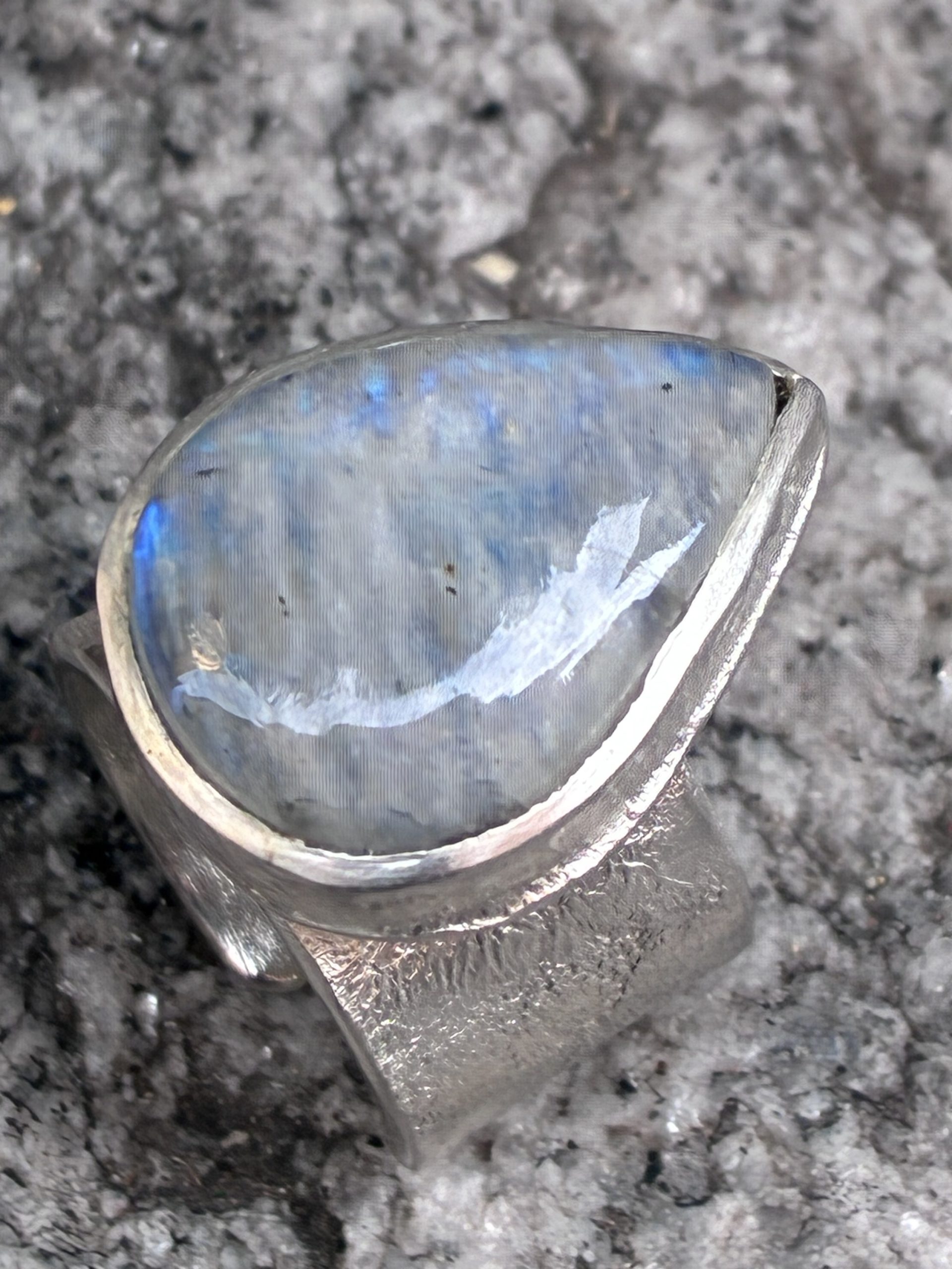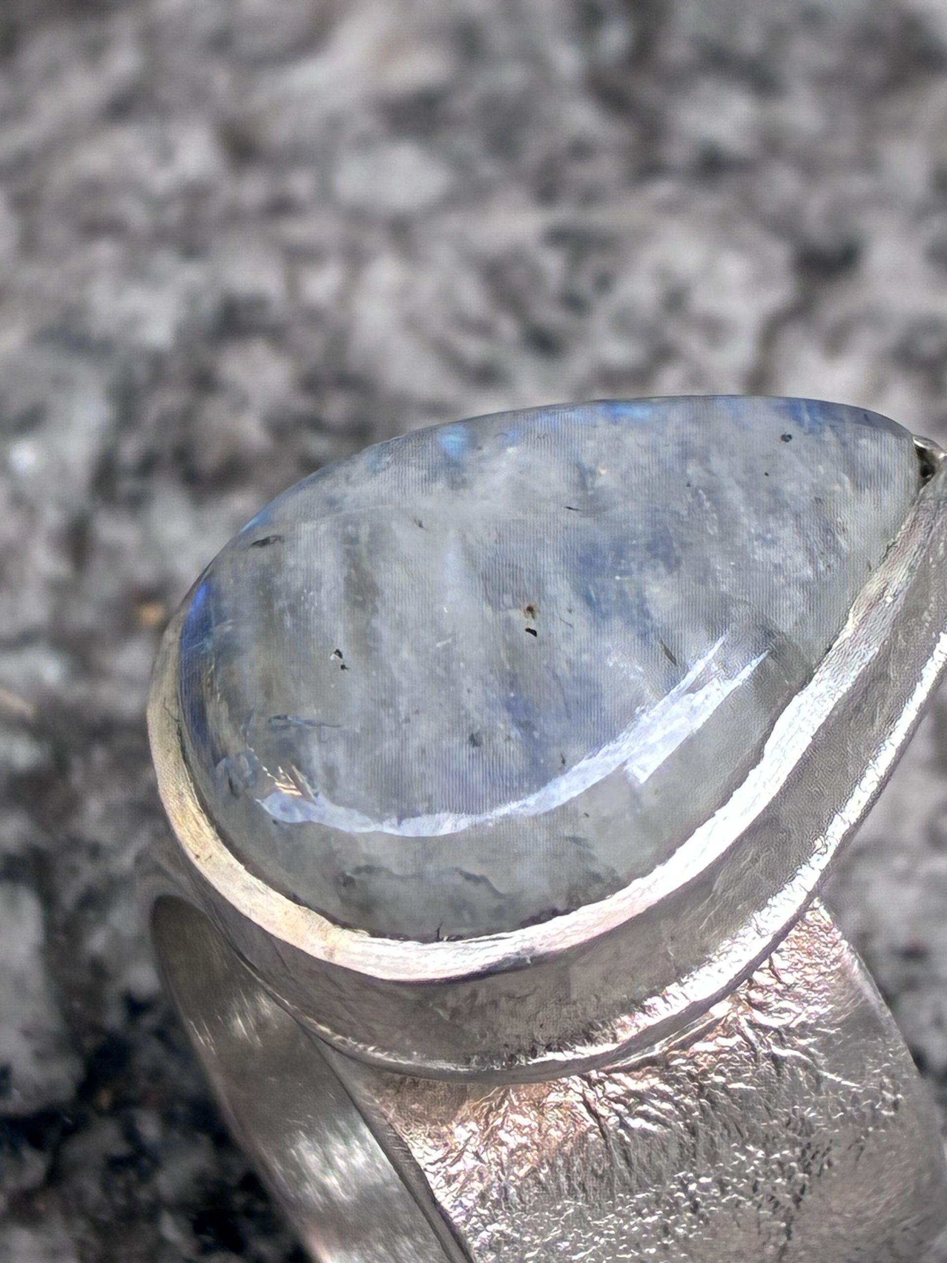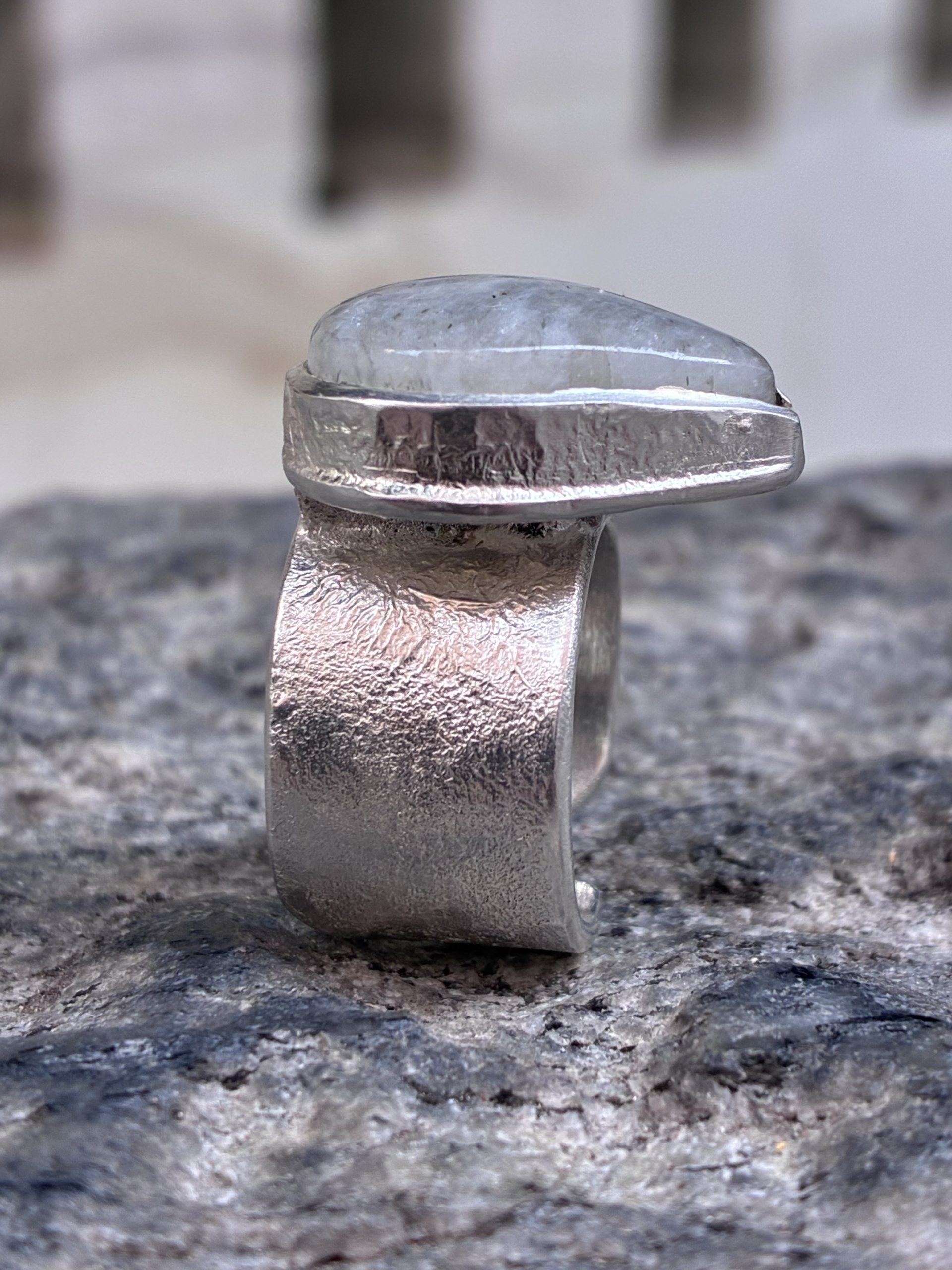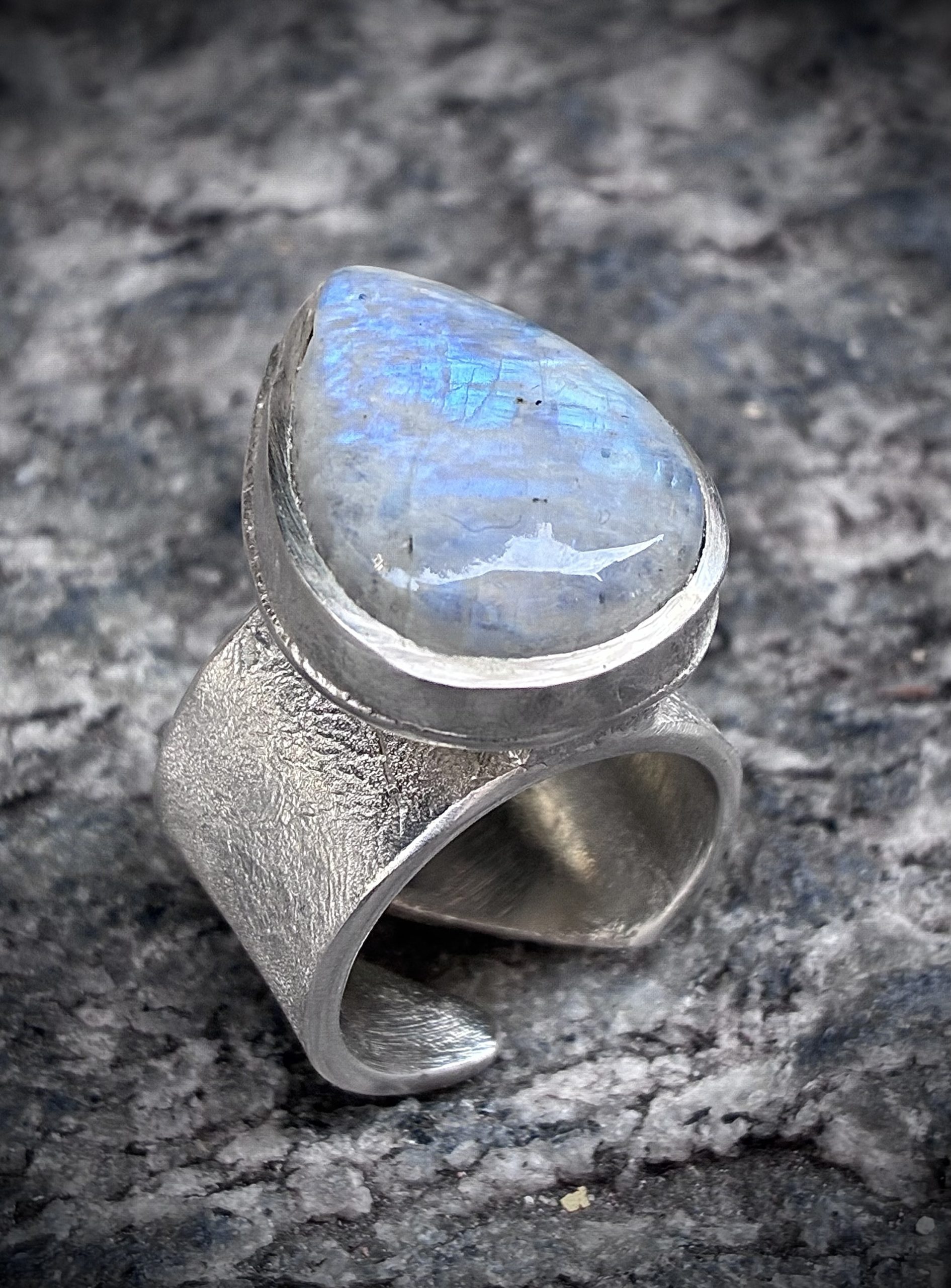 Lavorazione in argento su rame, rifinita con una placcatura in argento. La Pietraluna è stata montata leggermente decentrata per accompagnare meglio la linea della mano e creare una vestibilità più armoniosa e naturale.