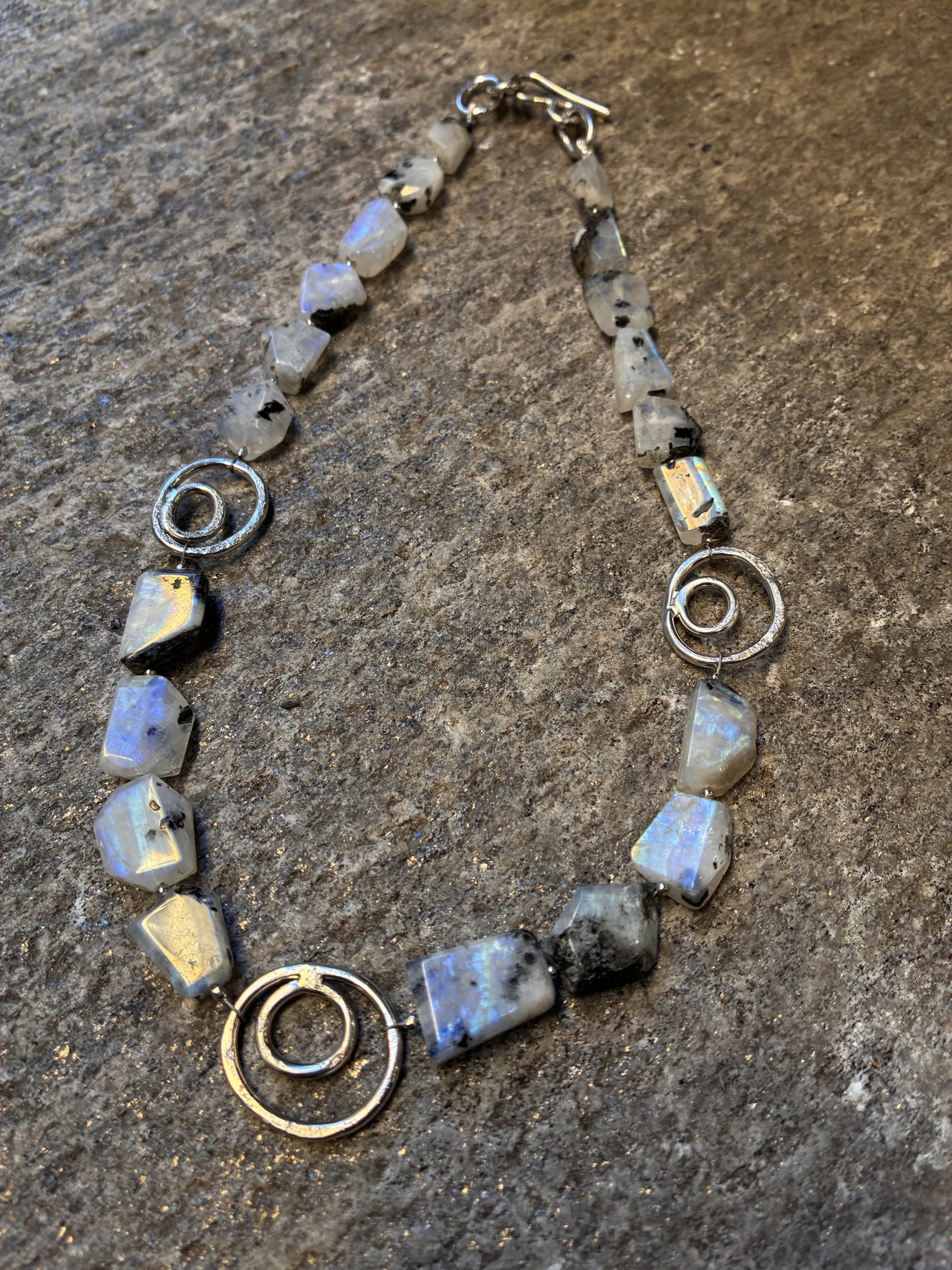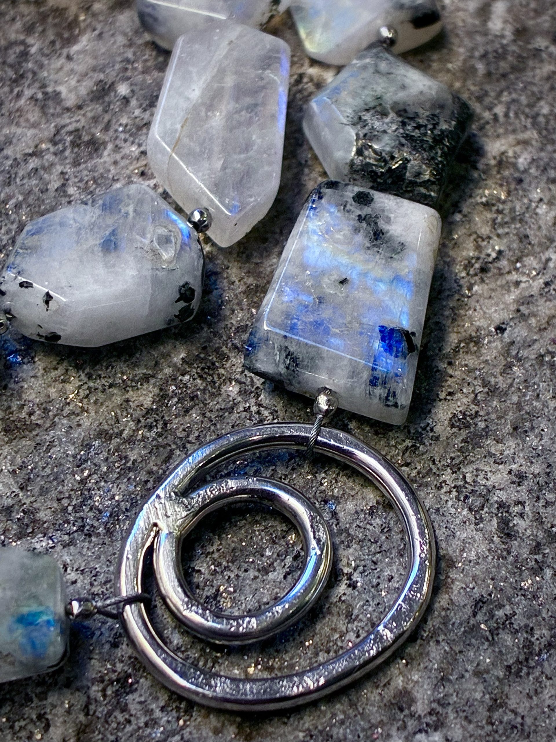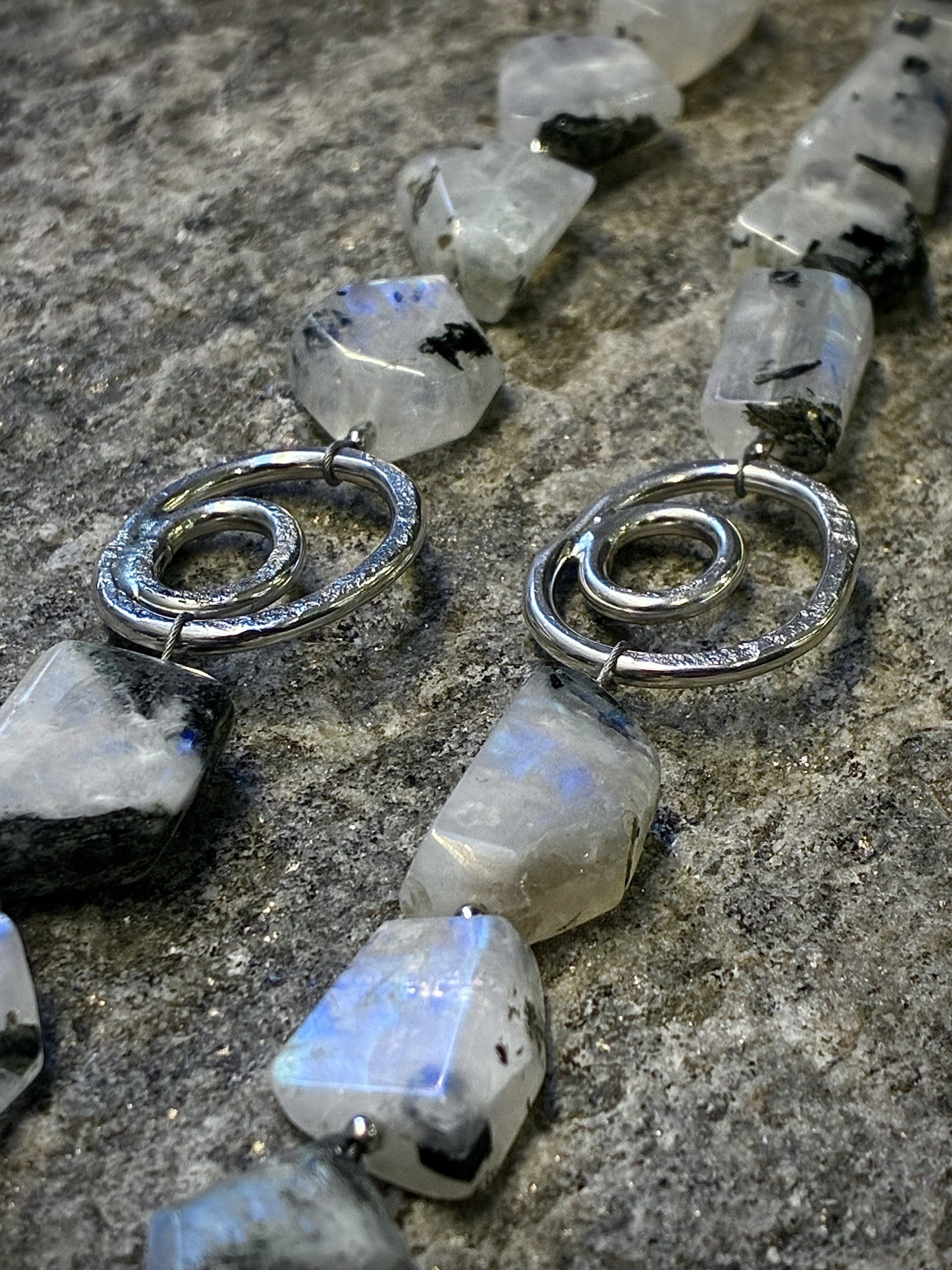 Collana realizzata con pietre di labradorite bianca, la Pietraluna, intervallate da elementi in argento 925.