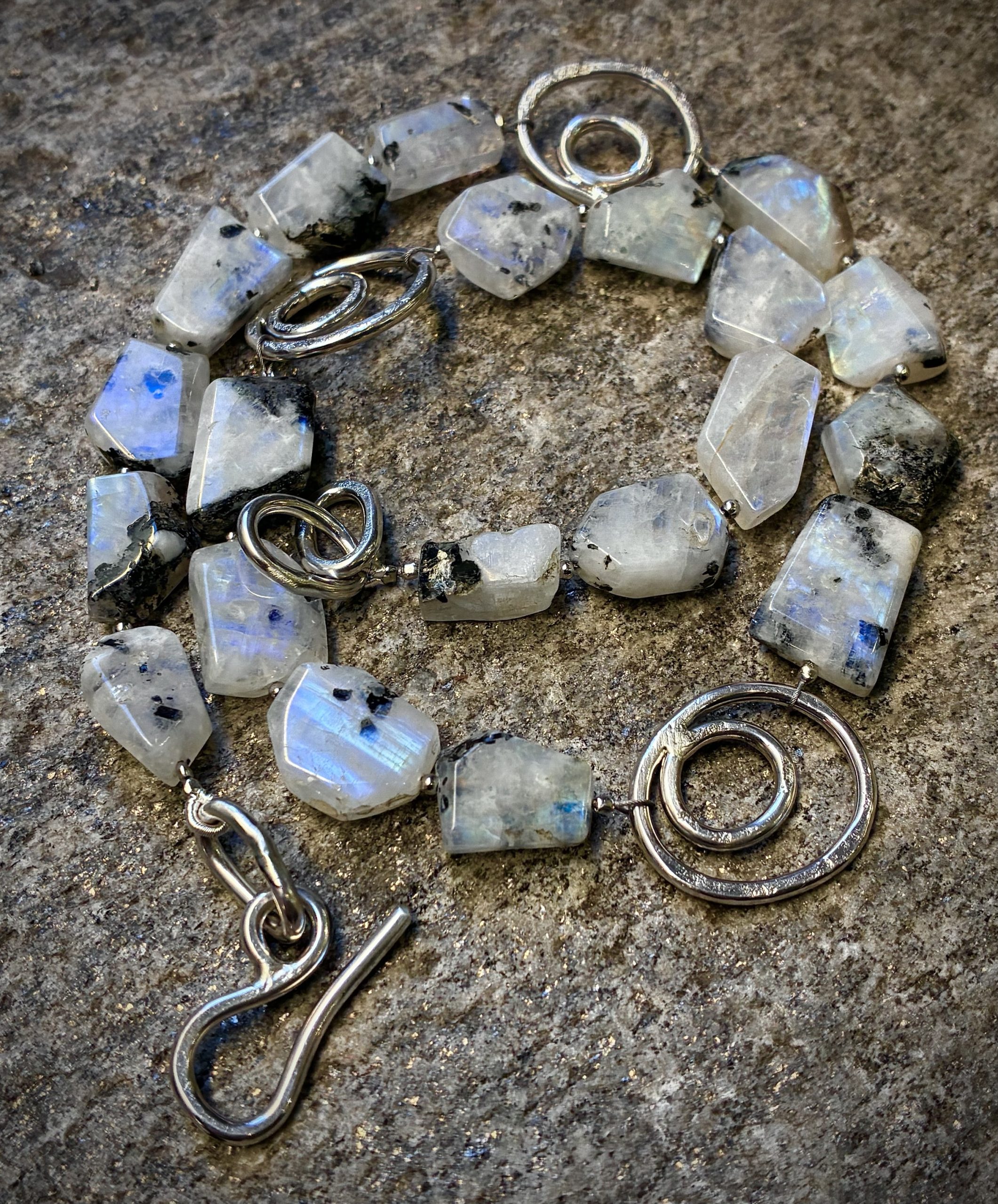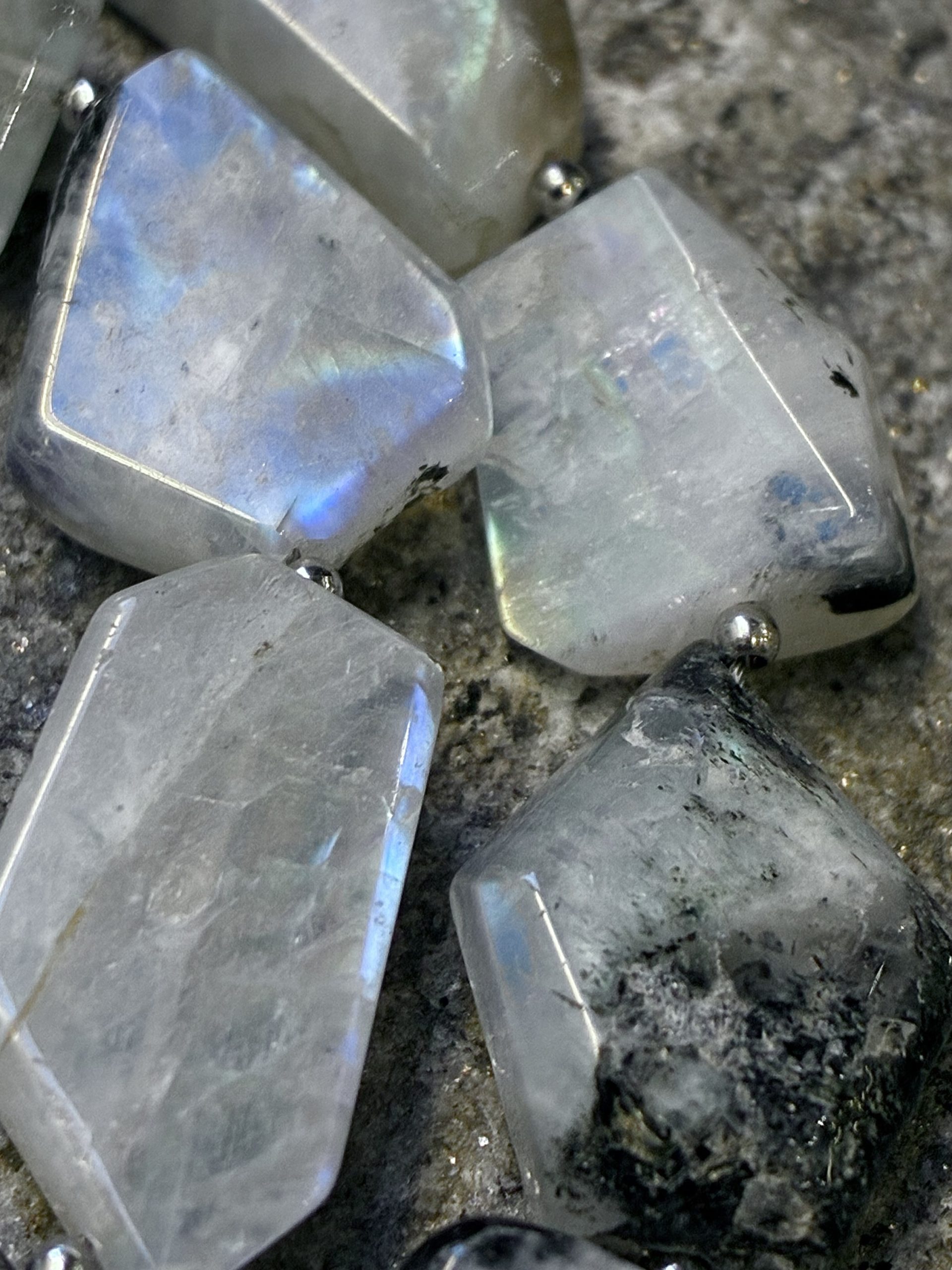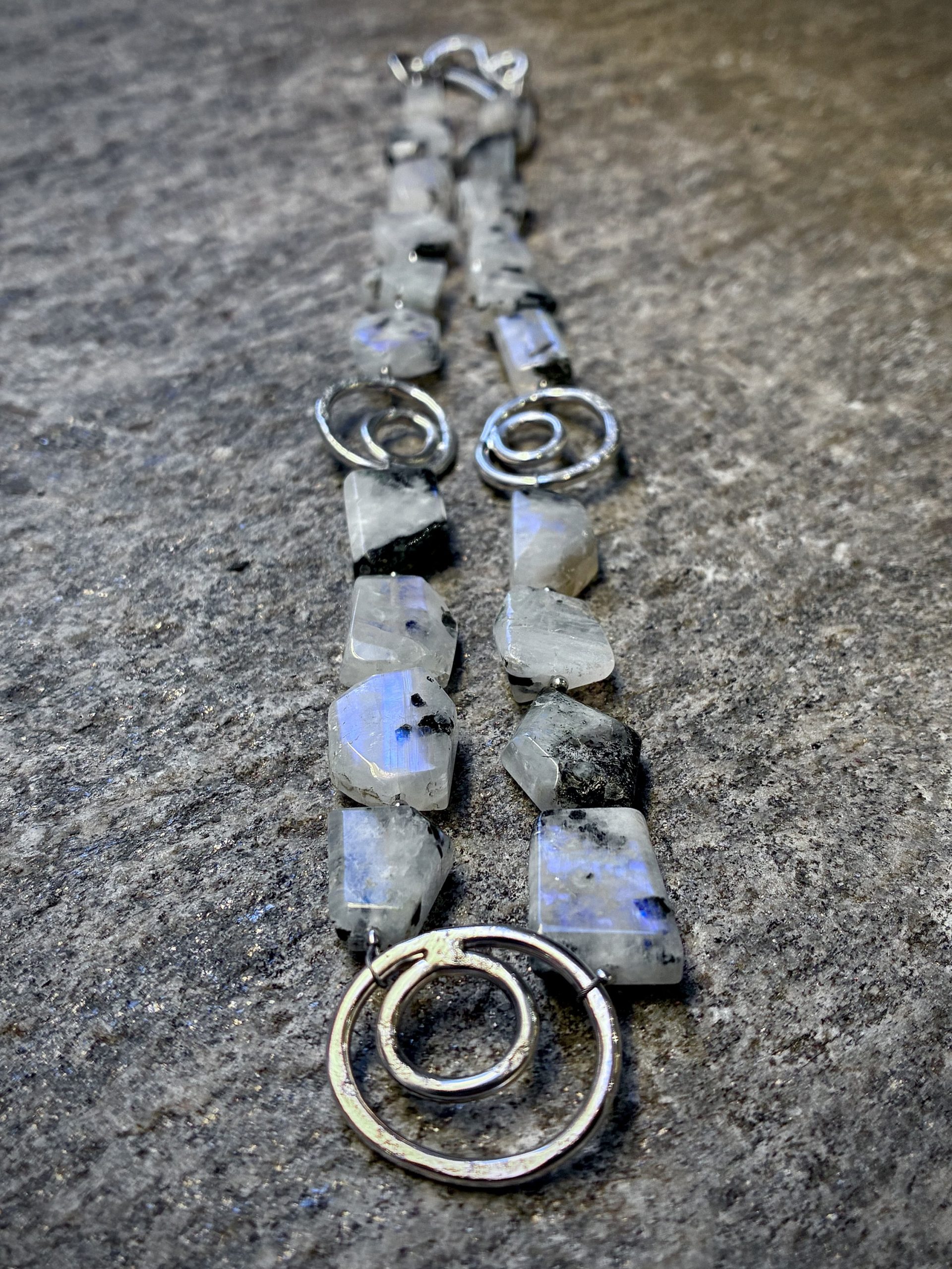 Collana realizzata con pietre di labradorite bianca, la Pietraluna, intervallate da elementi in argento 925.