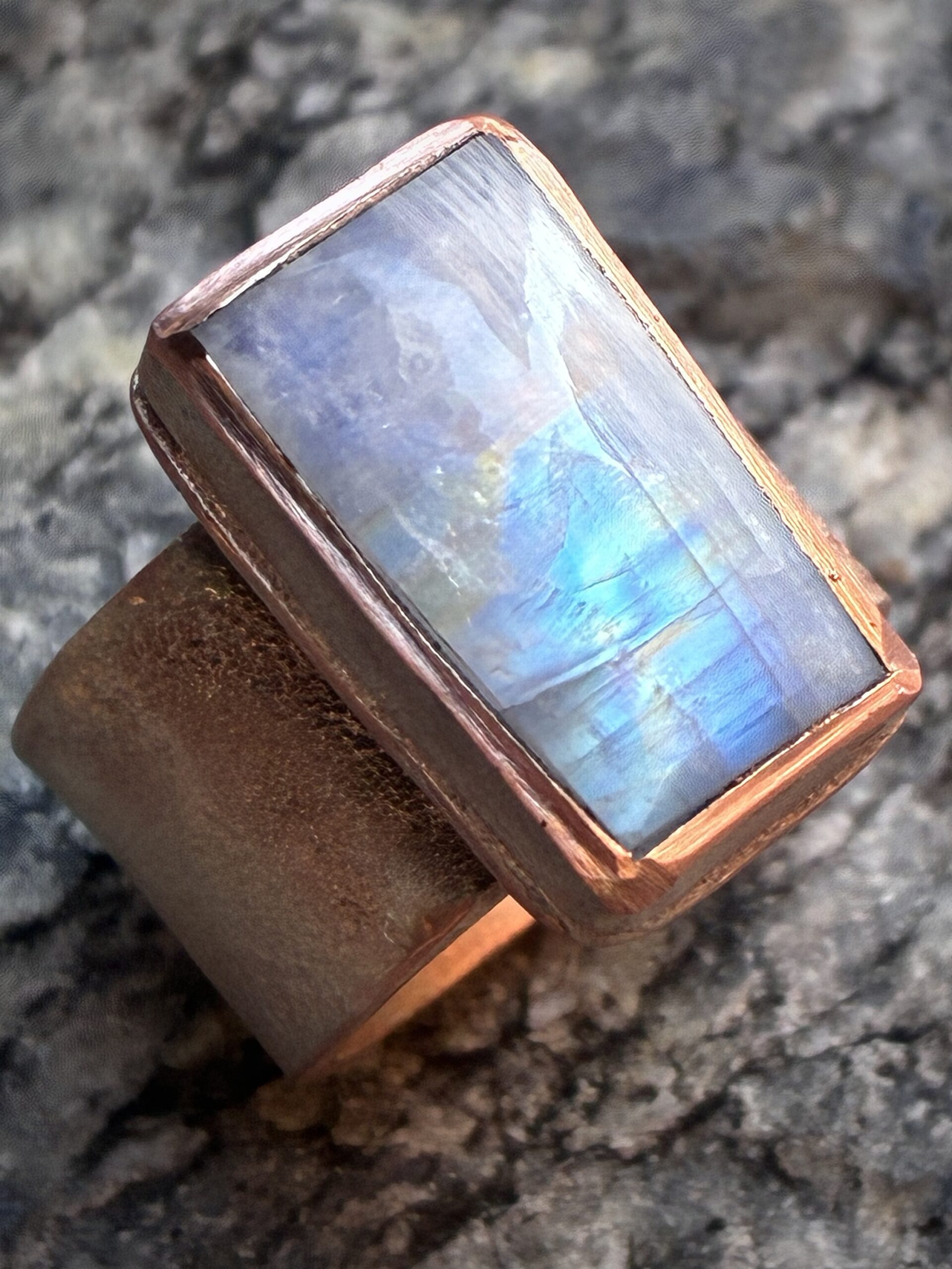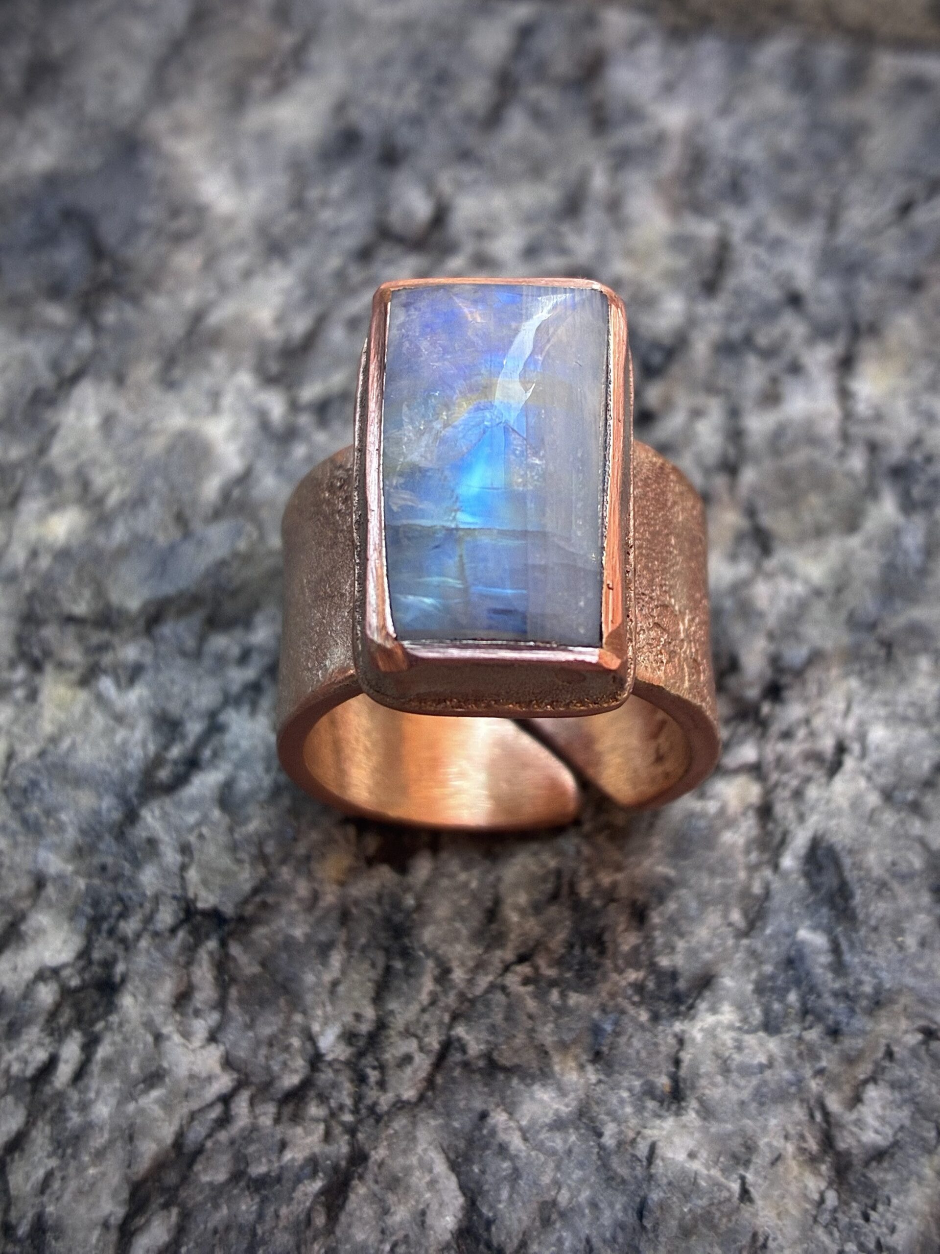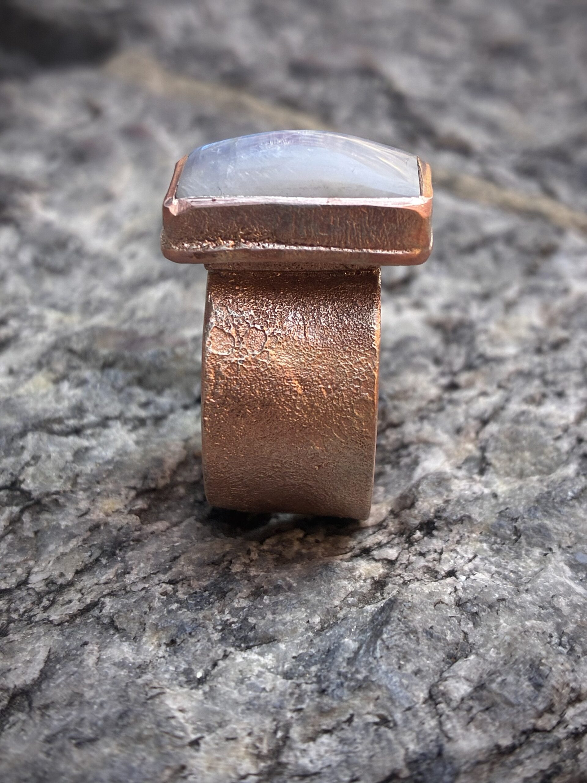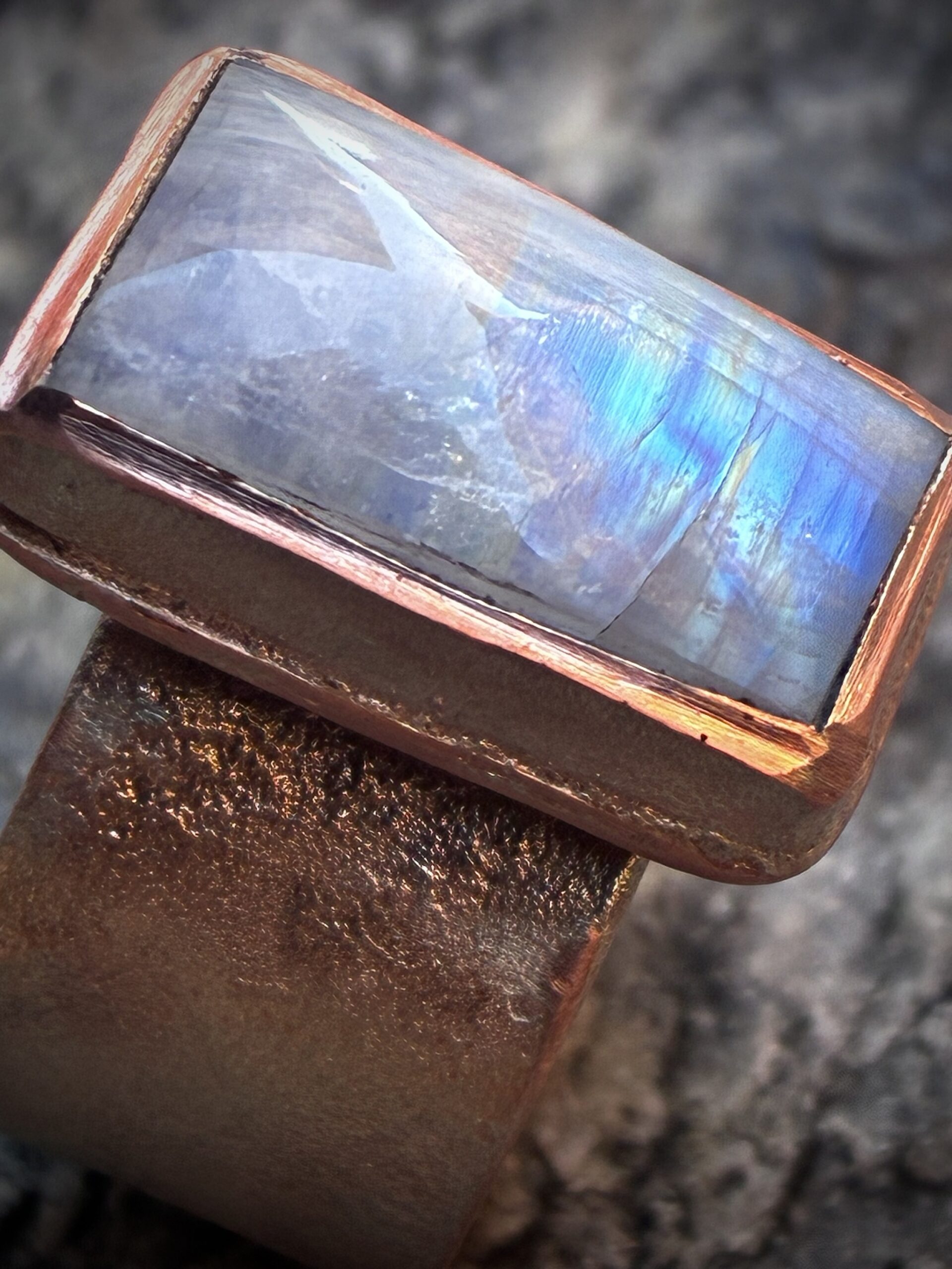 La montatura è realizzata artigianalmente in argento su rame, lavorati a fuoco, mantenendo una finitura essenziale e materica.