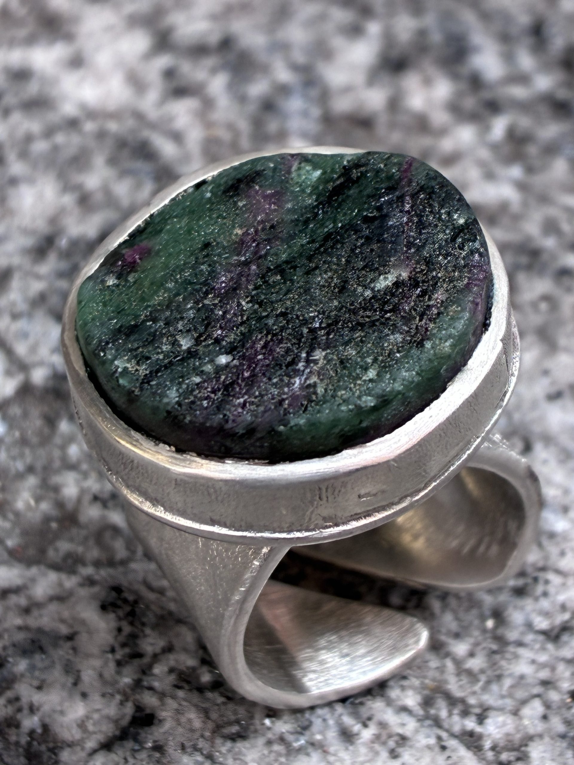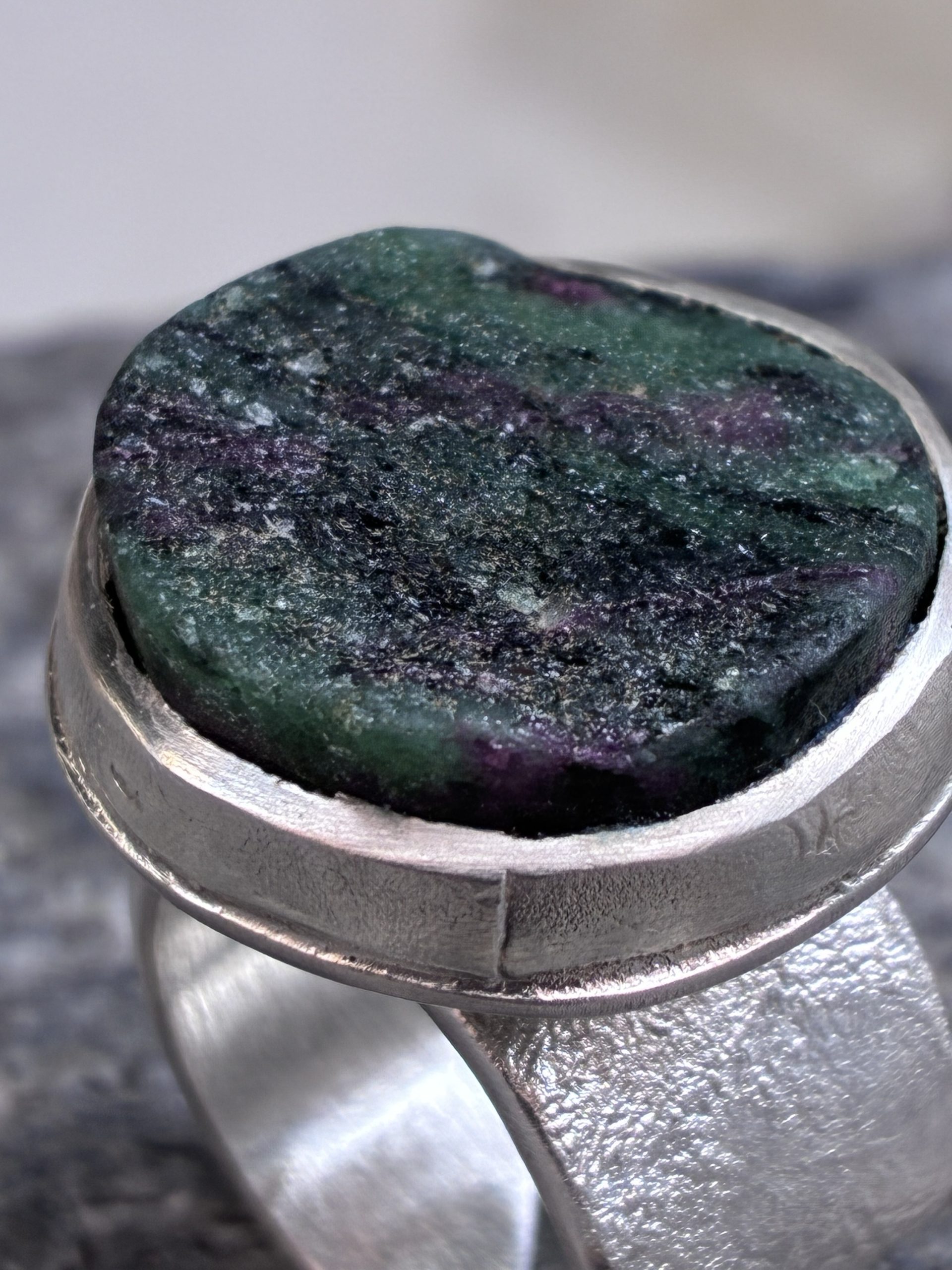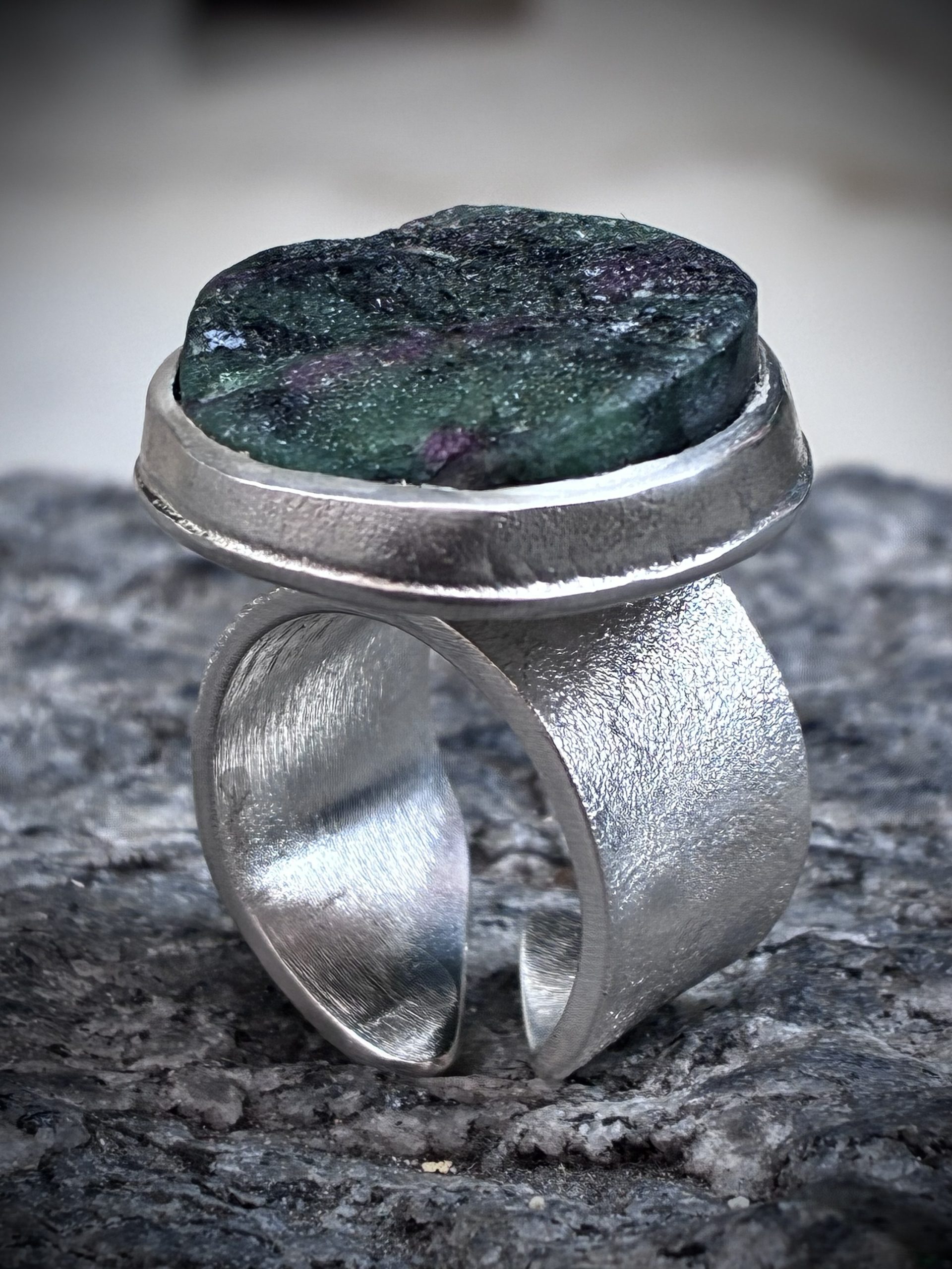 La pietra proviene da materiale grezzo ed è stata lavorata qui in atelier: ho mantenuto la superficie superiore naturale, intervenendo solo sui bordi per armonizzare la forma senza perdere il carattere originale del minerale.