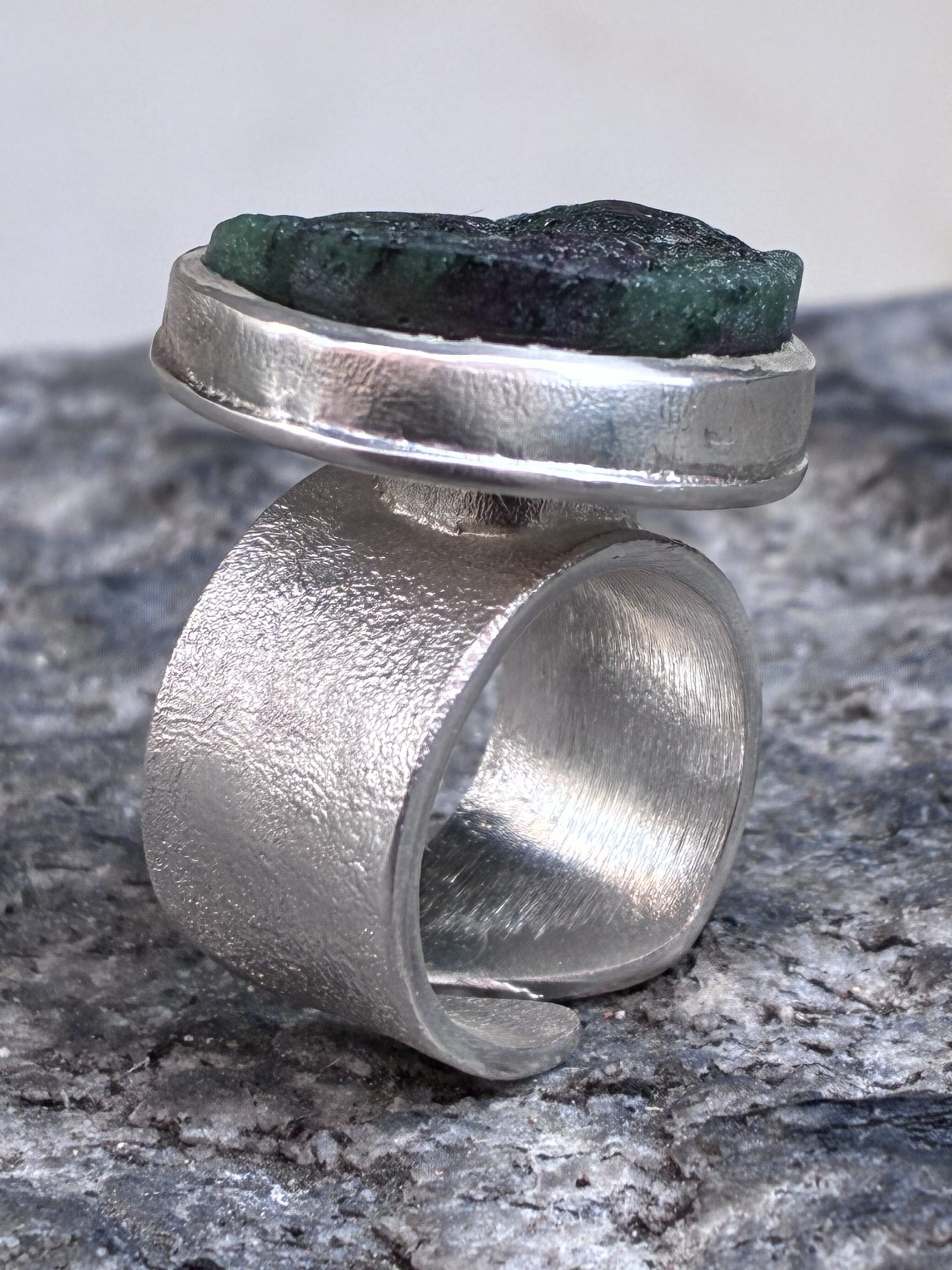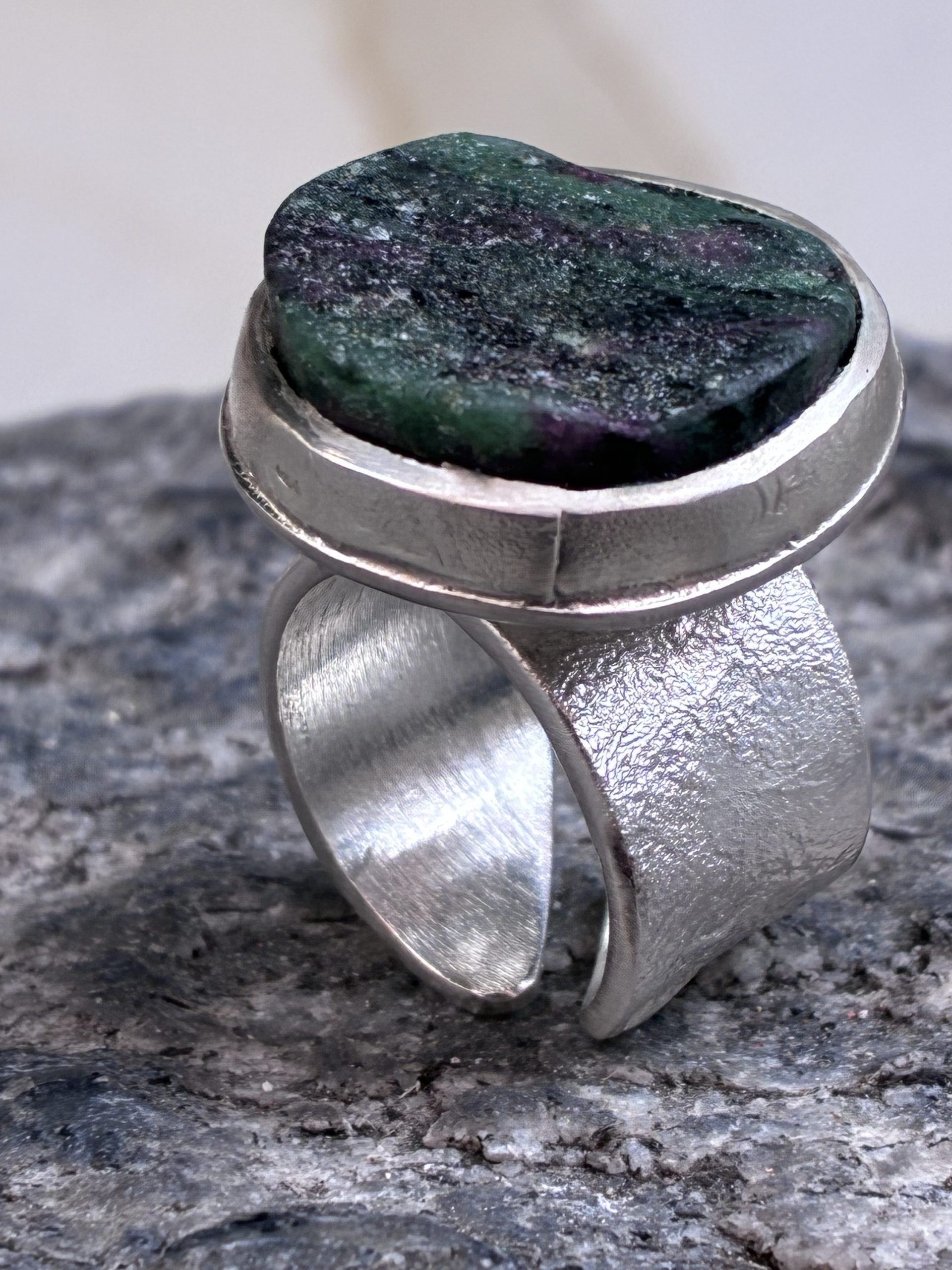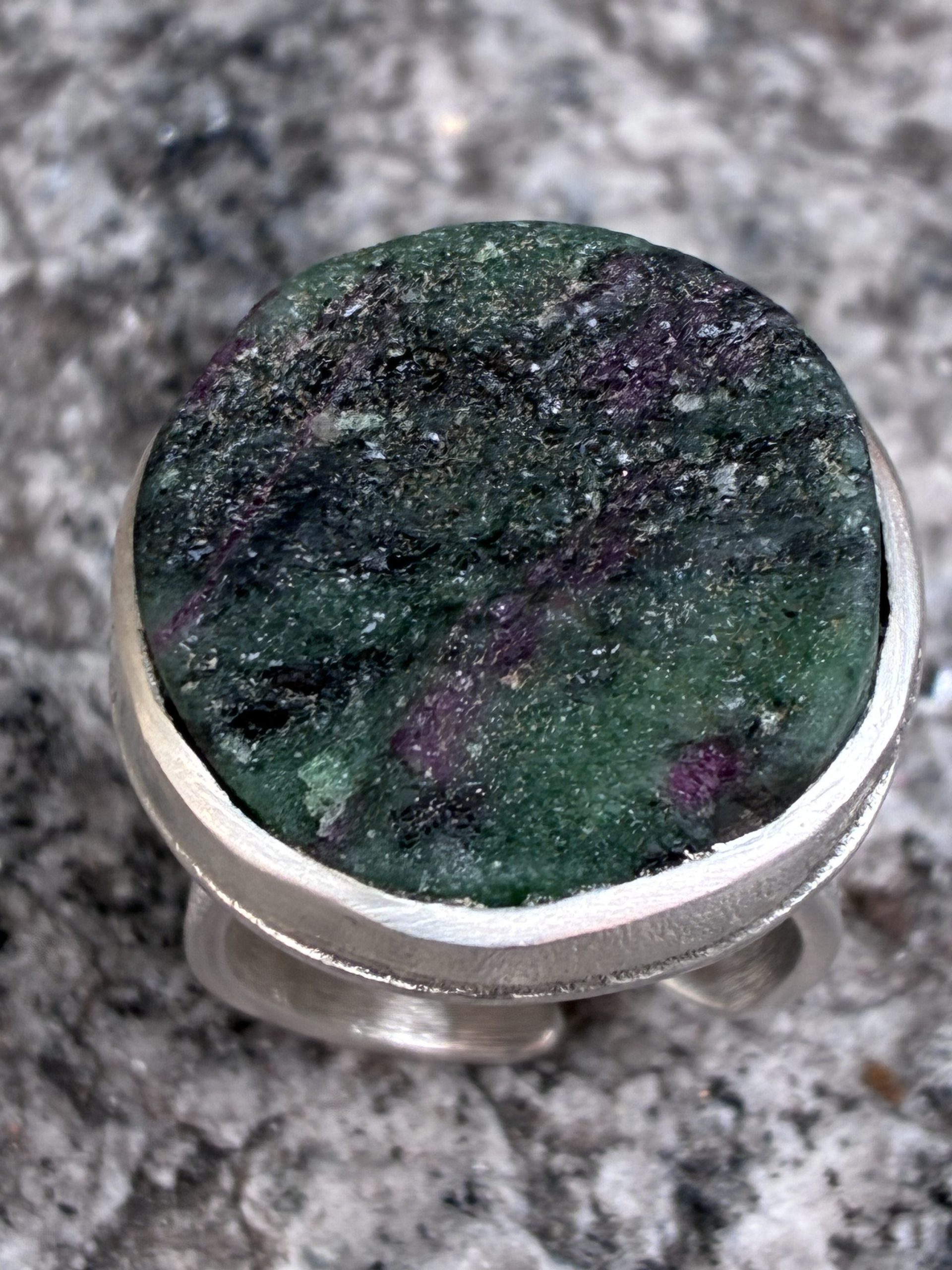 La pietra proviene da materiale grezzo ed è stata lavorata qui in atelier: ho mantenuto la superficie superiore naturale, intervenendo solo sui bordi per armonizzare la forma senza perdere il carattere originale del minerale.