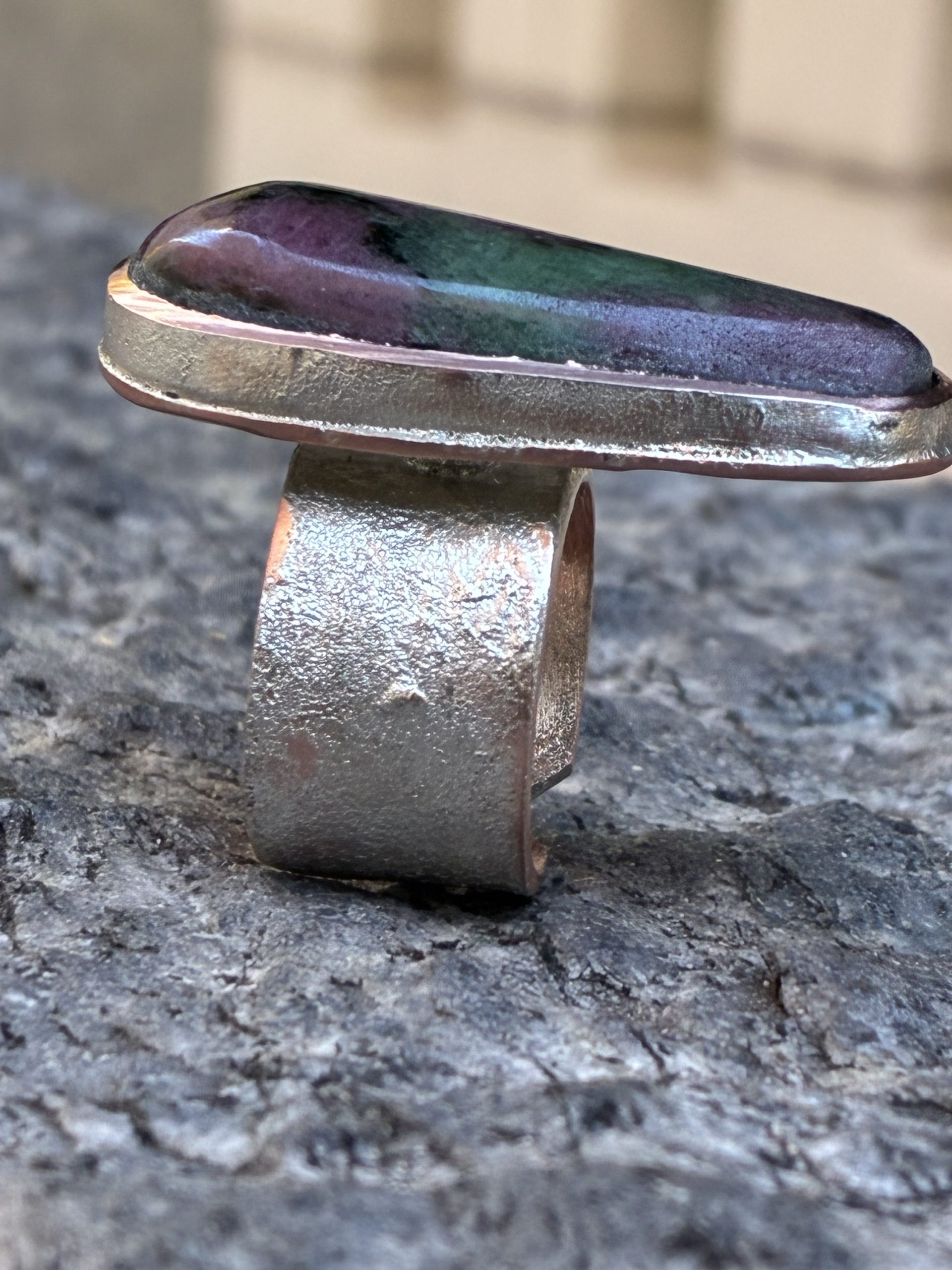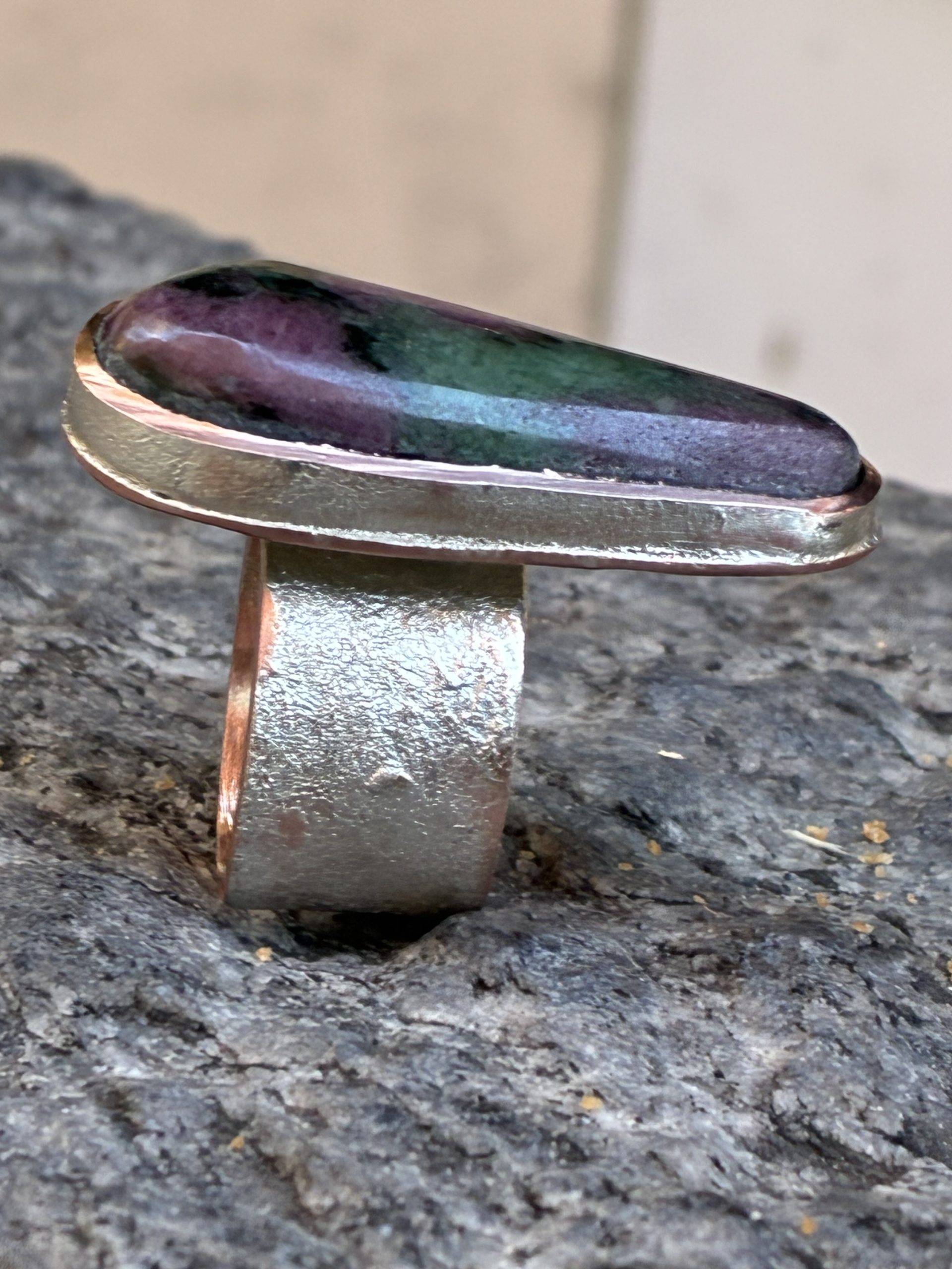 Lavorazione in argento su rame, amalgamati a fuoco per ottenere una tonalità rosata e irregolare, tipica dei pezzi modellati a mano.