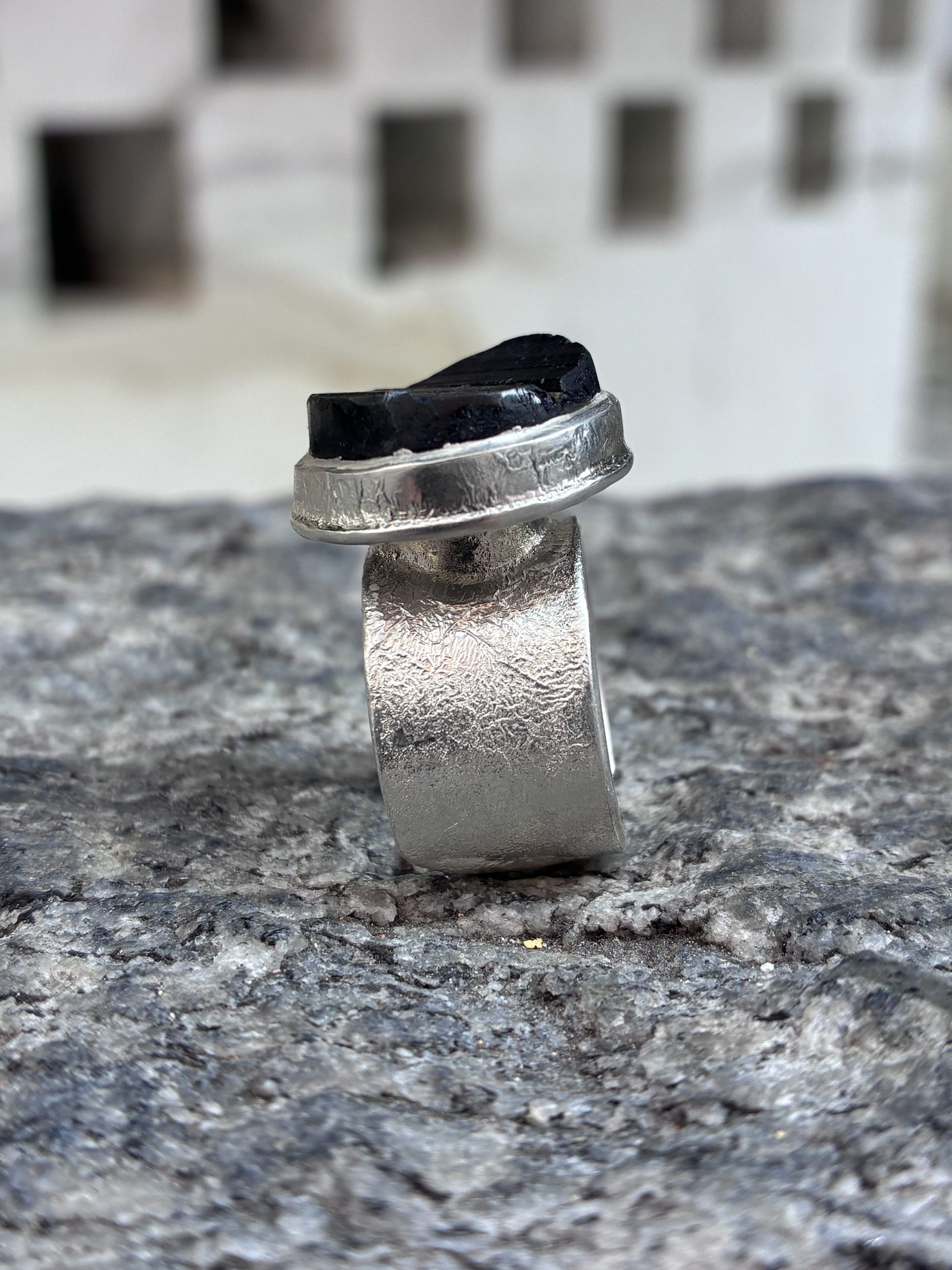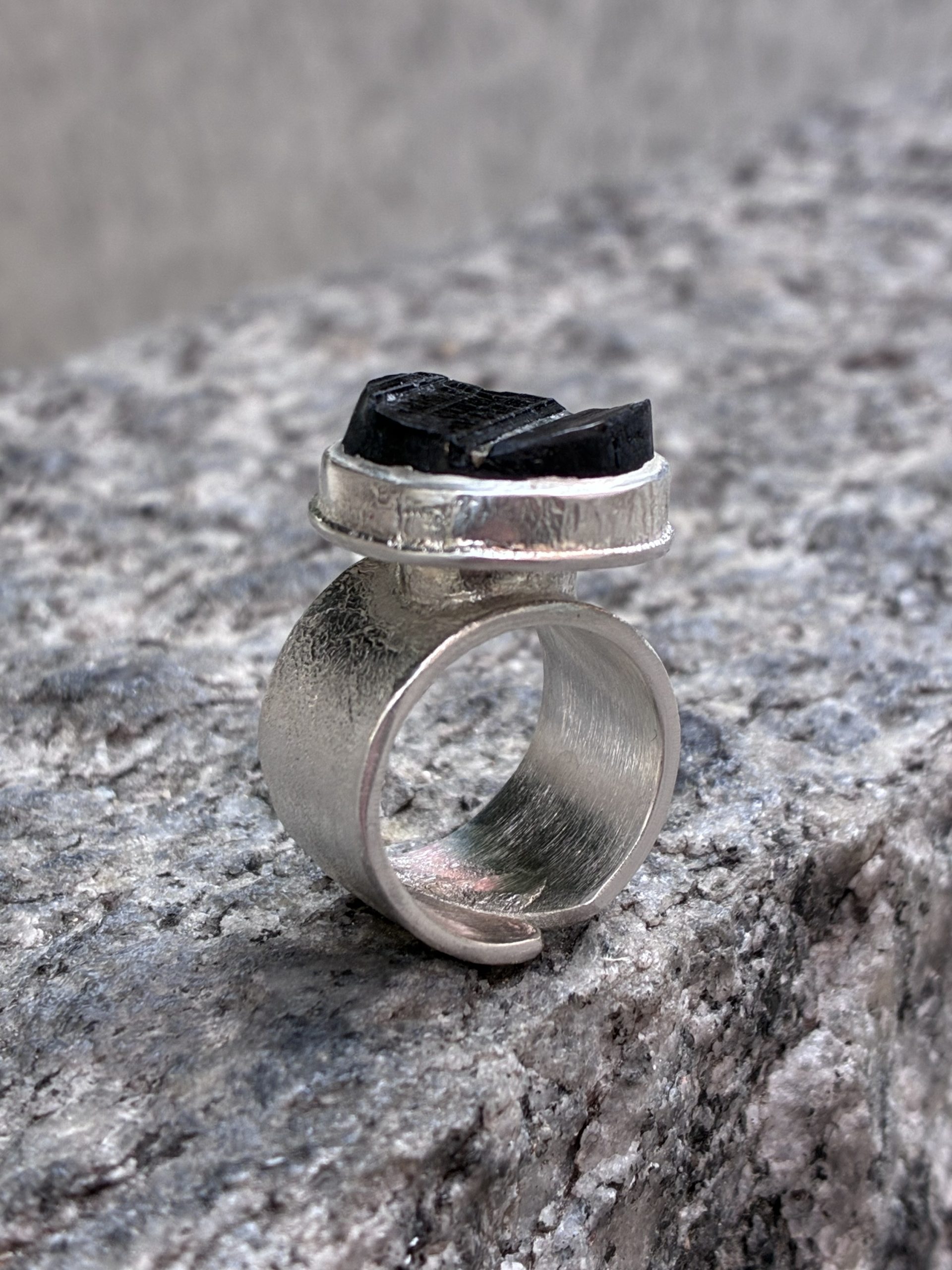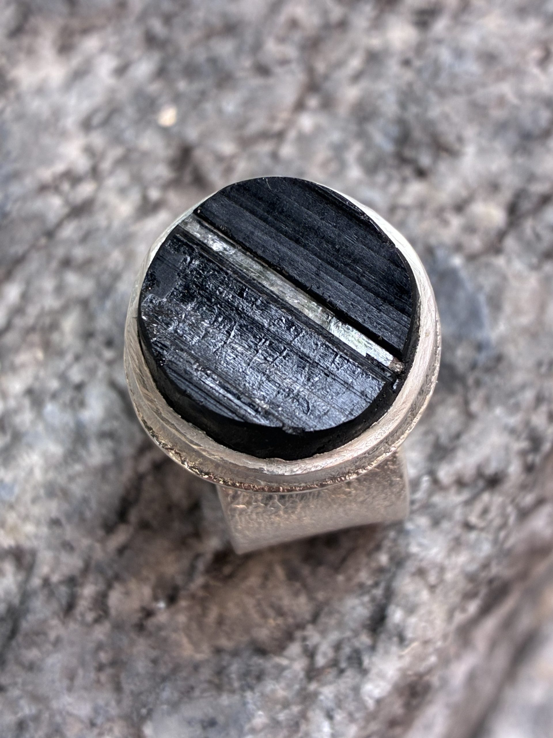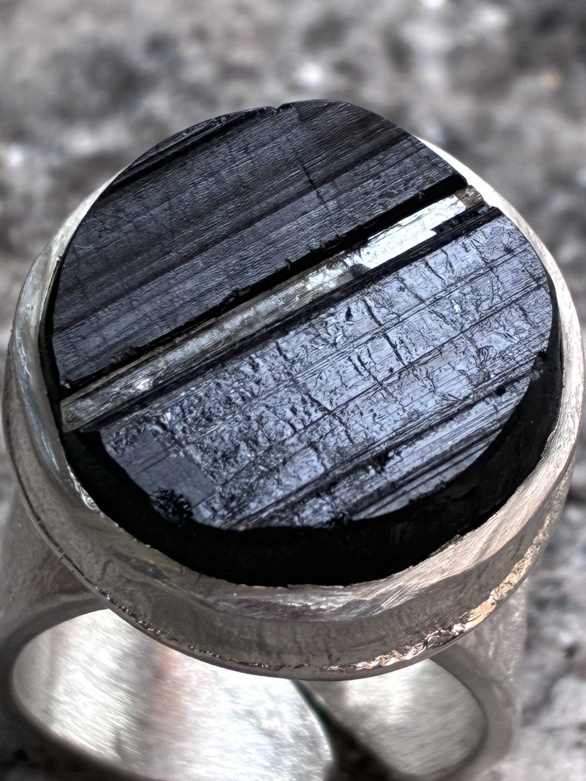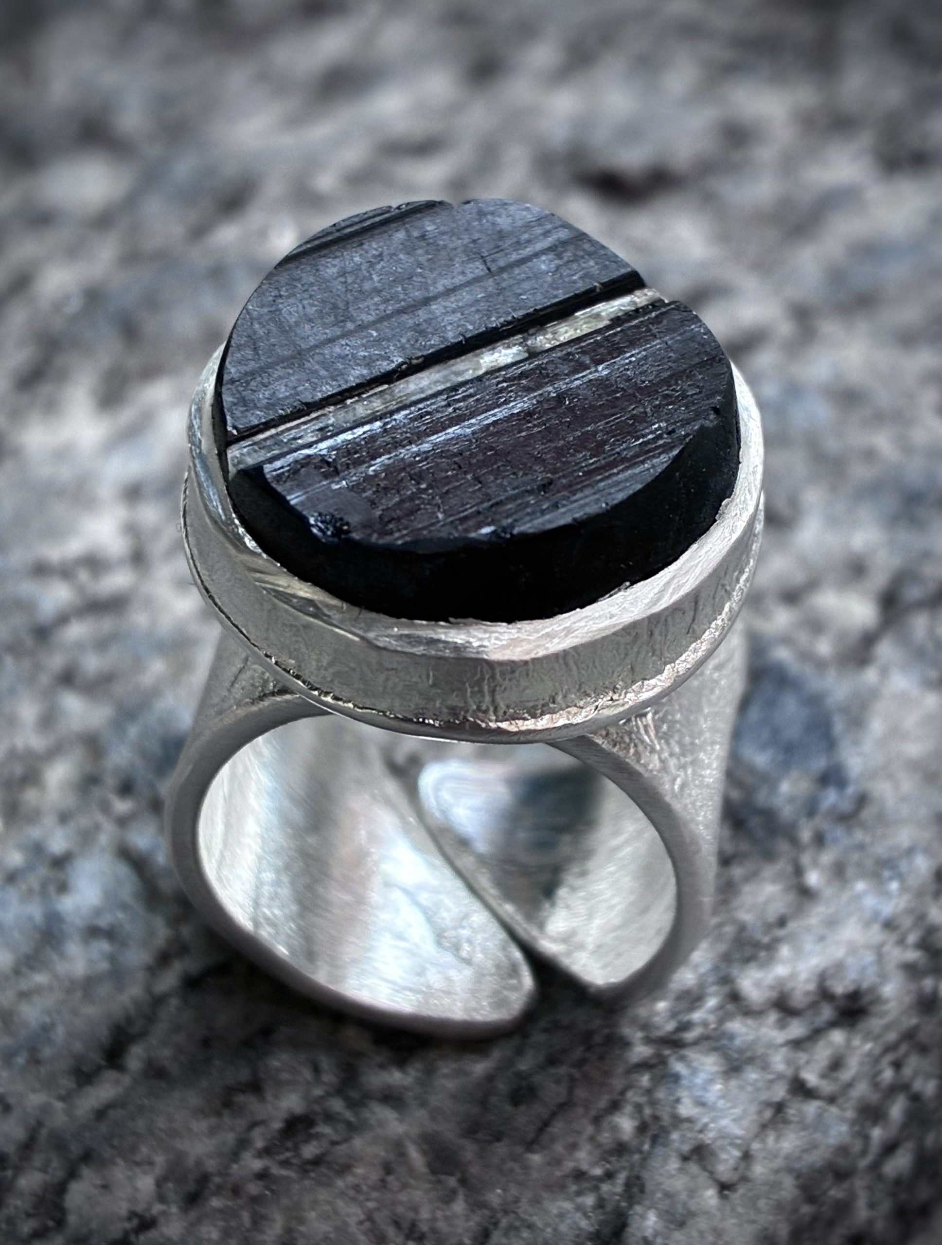 Da un frammento di materiale grezzo di Tormalina Nera ho tagliato e ricavato questa forma, lasciando esposta la cristallizzazione naturale.